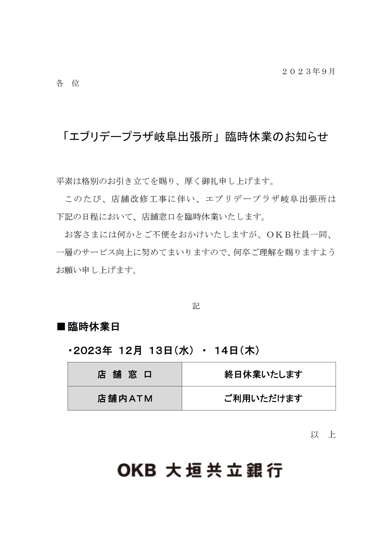 「エブリデープラザ岐阜出張所」 臨時休業のお知らせ