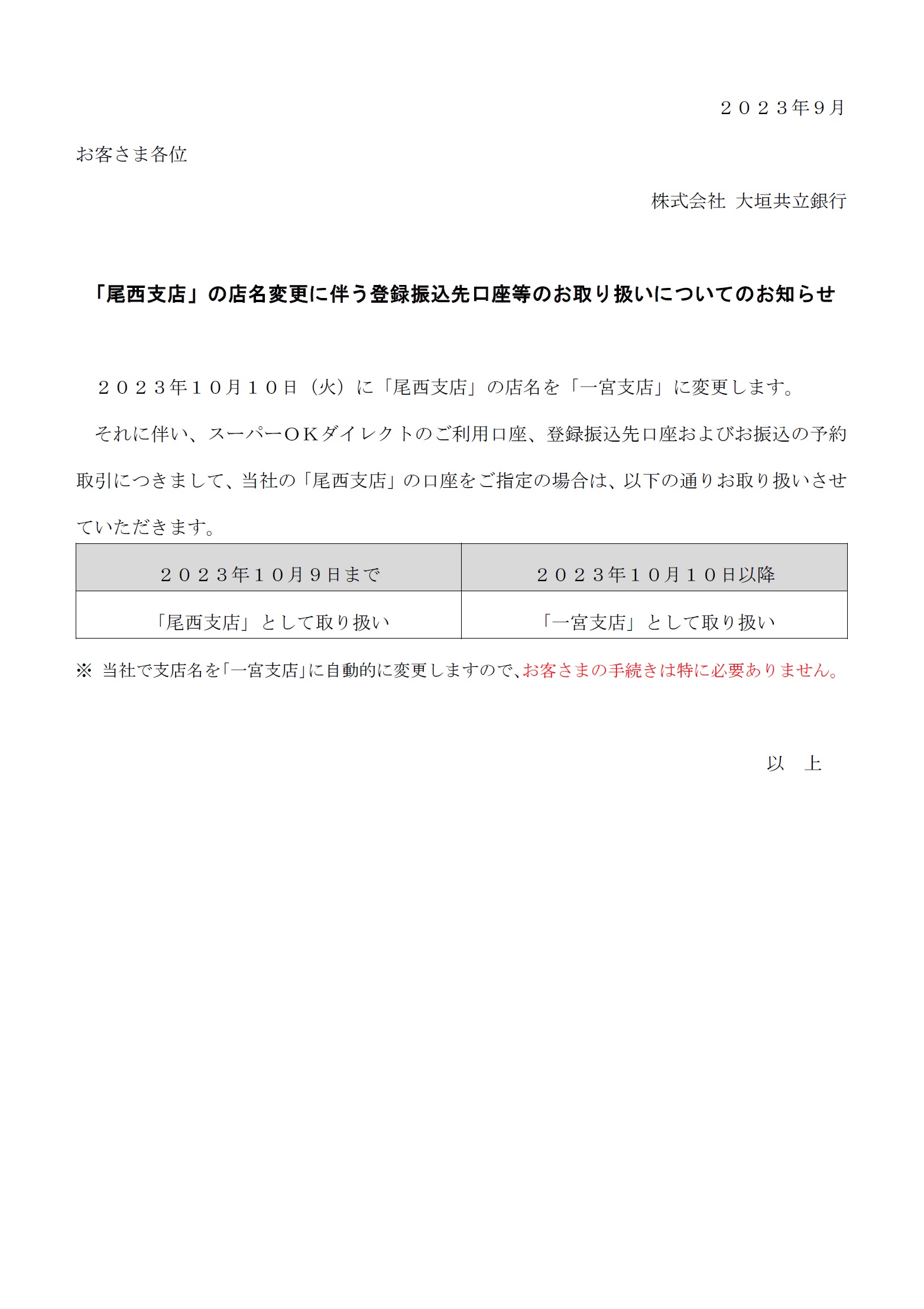 「尾西支店」の店名変更に伴う登録振込先口座等のお取り扱いについてのお知らせ