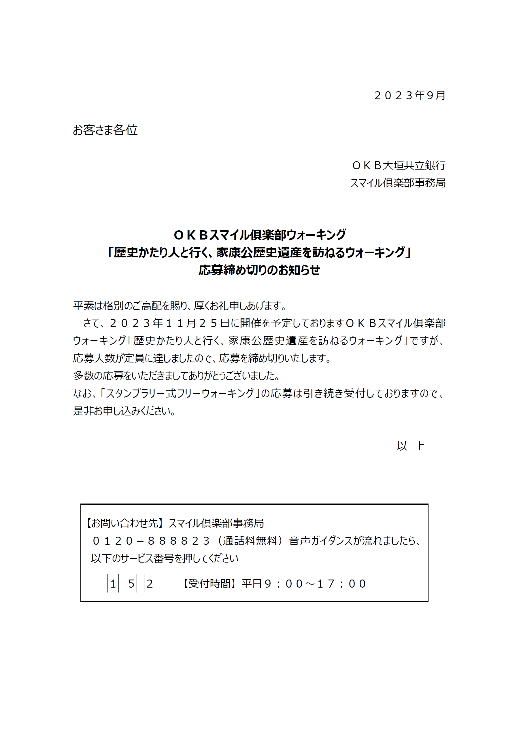 OKBスマイル俱楽部ウォーキング 「歴史かたり人と行く、家康公歴史遺産を訪ねるウォーキング」 応募締め切りのお知らせ