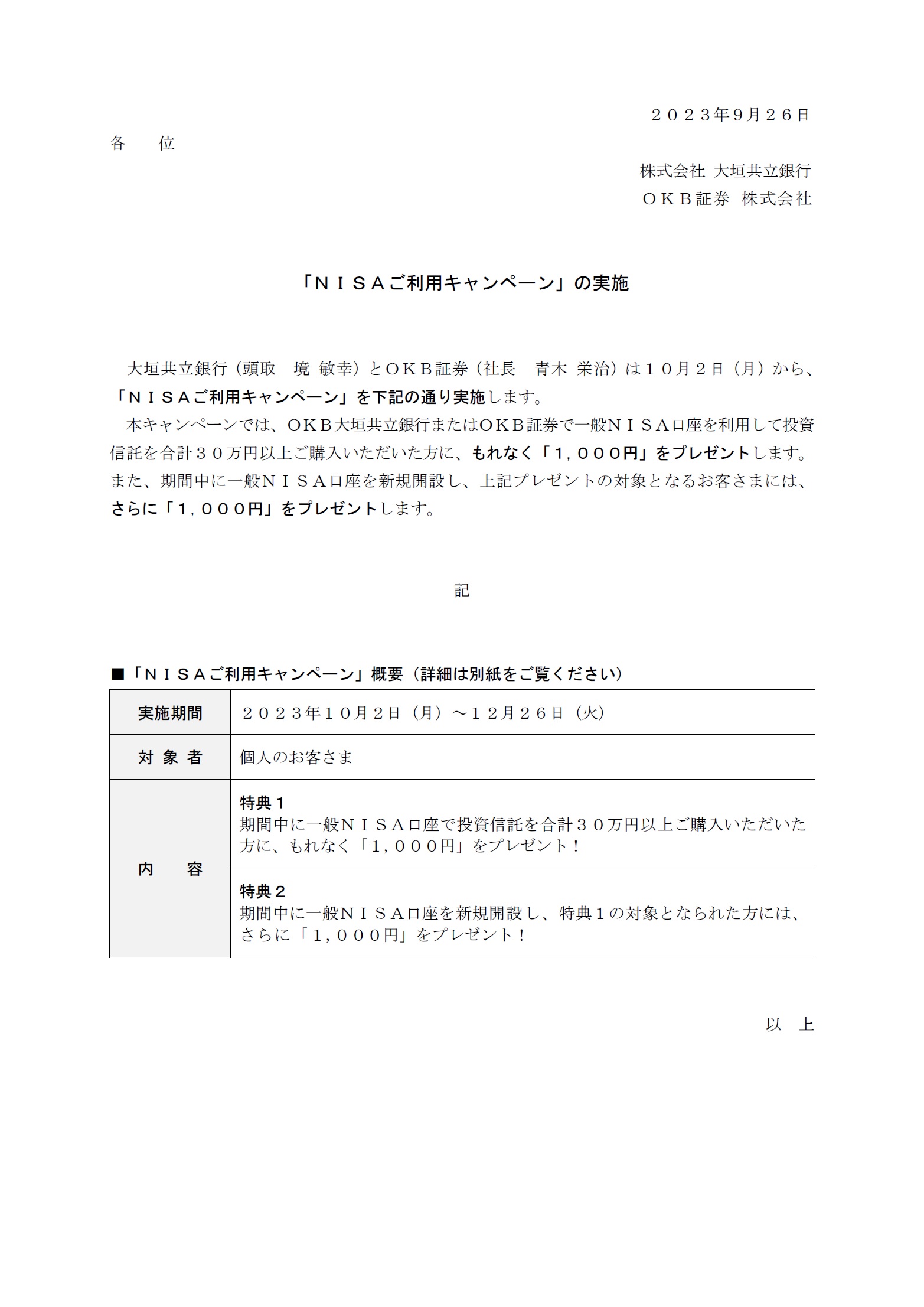 「NISAご利用キャンペーン」の実施
