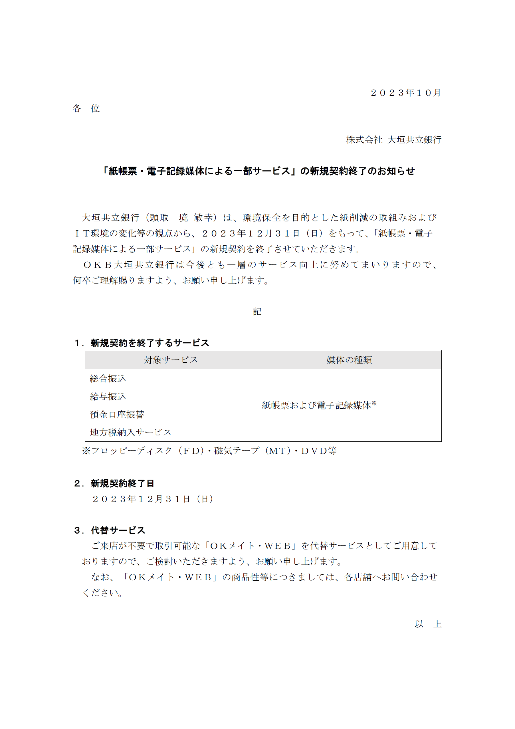 「紙帳票・電子記録媒体による一部サービス」の新規契約終了のお知らせ
