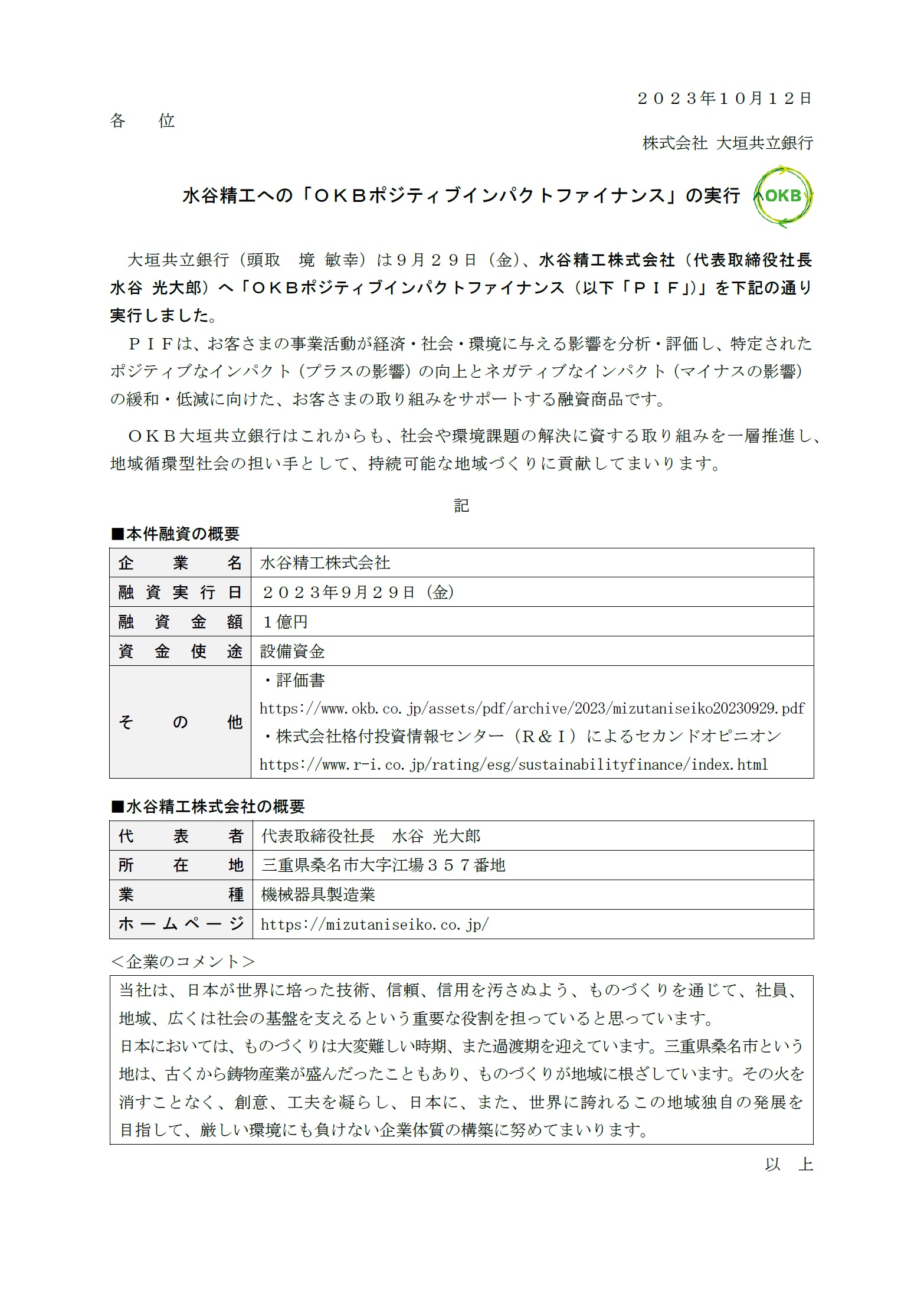 水谷精工への「OKBポジティブインパクトファイナンス」の実行
