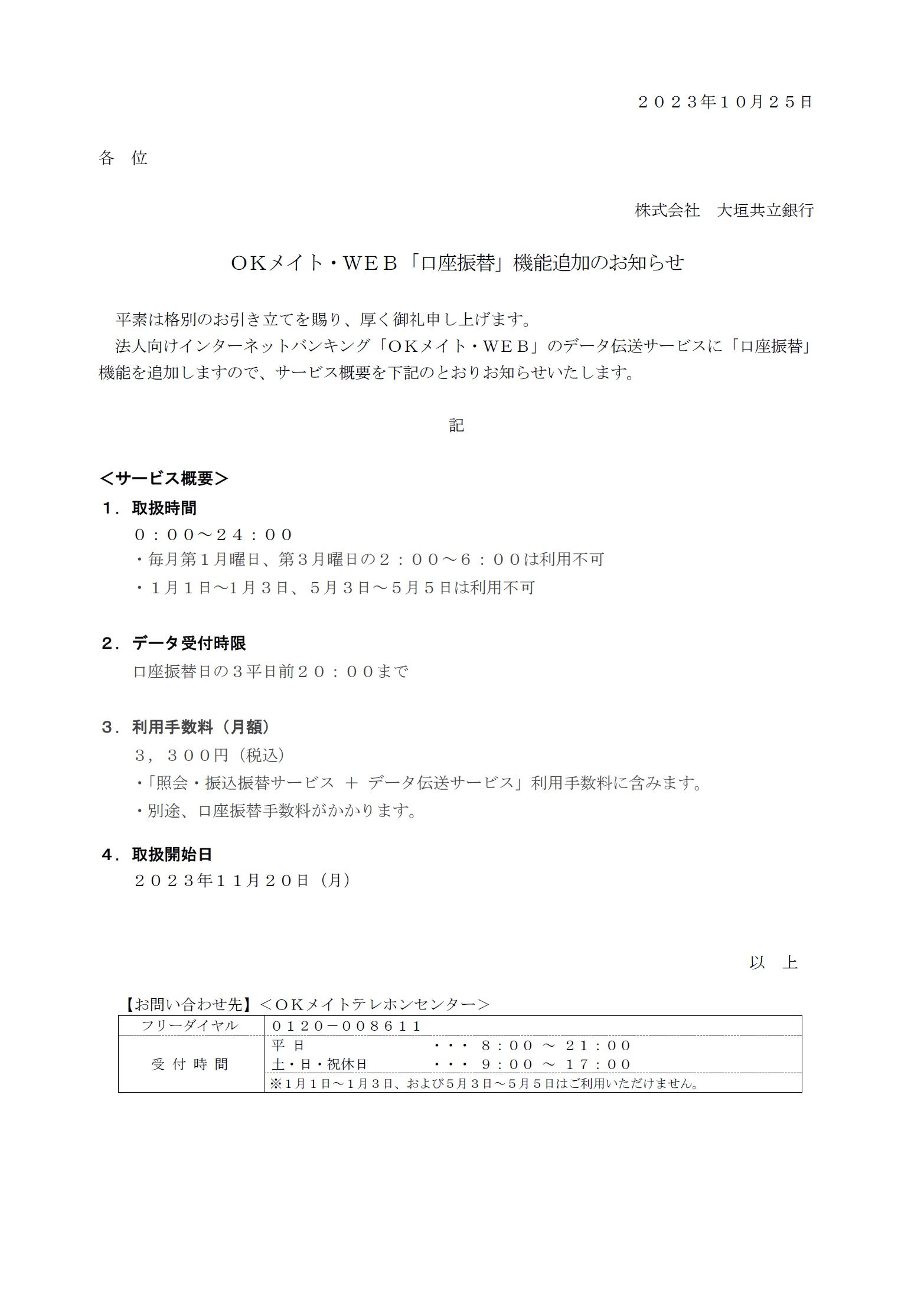 OKメイト・WEB「口座振替」機能追加のお知らせ