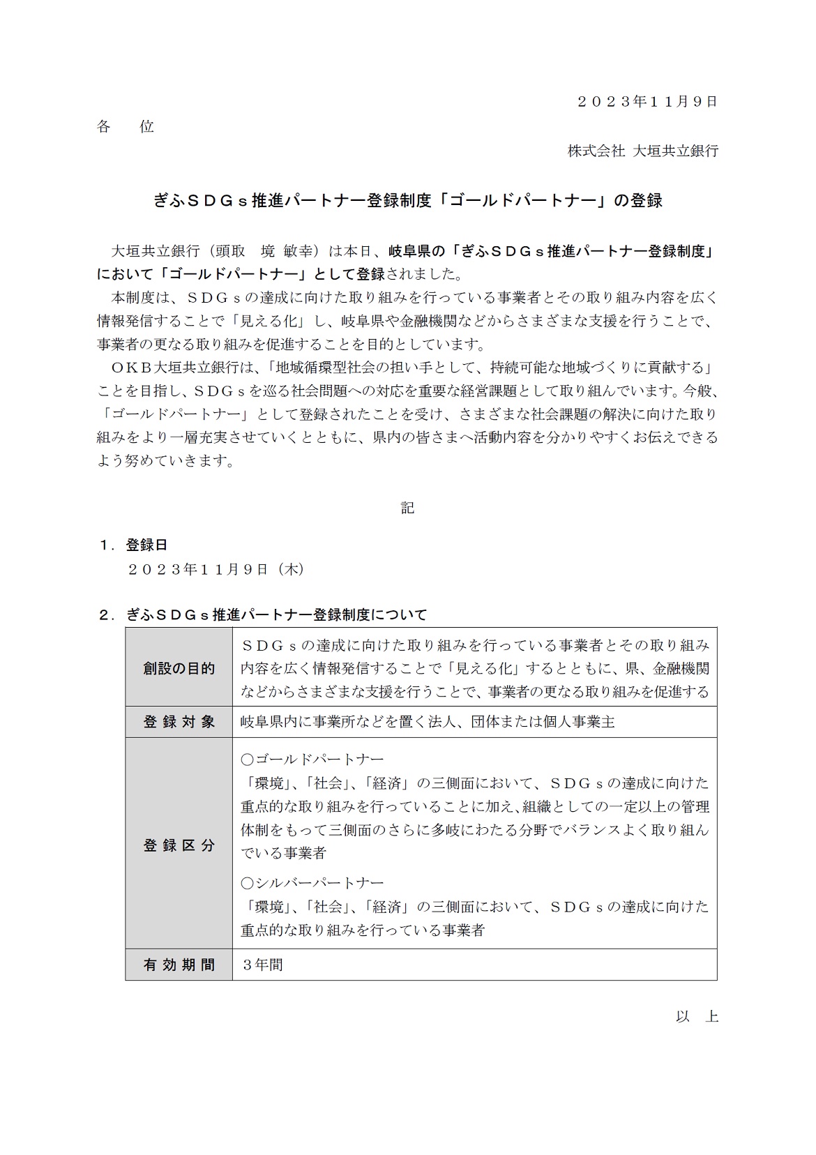 ぎふSDGs推進パートナー登録制度「ゴールドパートナー」の登録