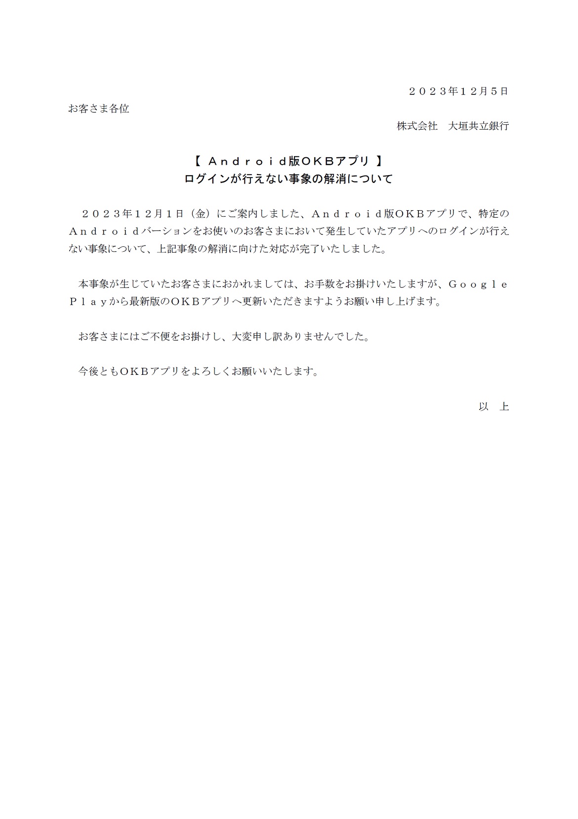 【 Android版OKBアプリ 】ログインが行えない事象の解消について