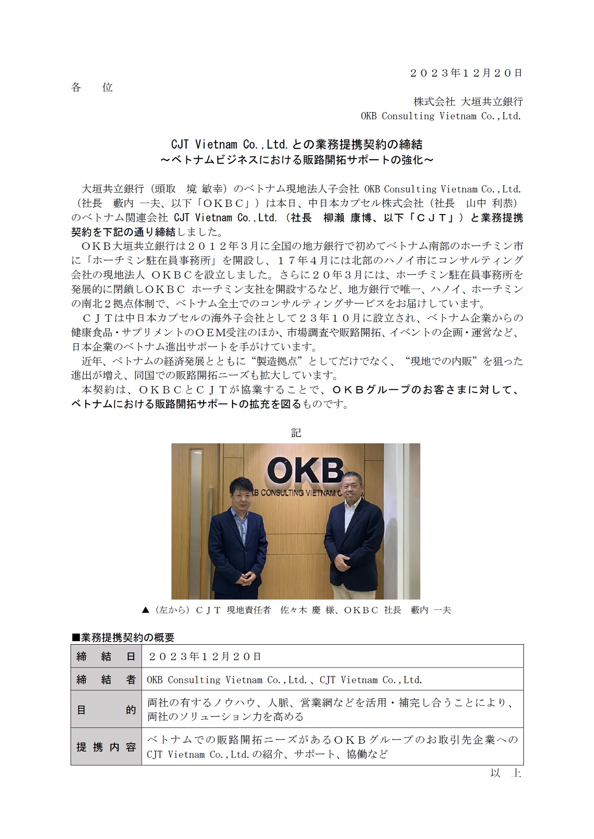 CJT Vietnam Co.,Ltd.との業務提携契約の締結