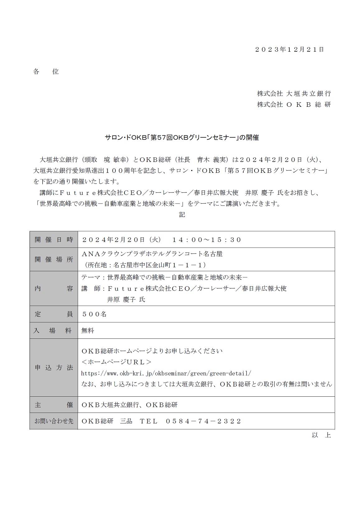 サロン・ドOKB「第57回OKBグリーンセミナー」の開催