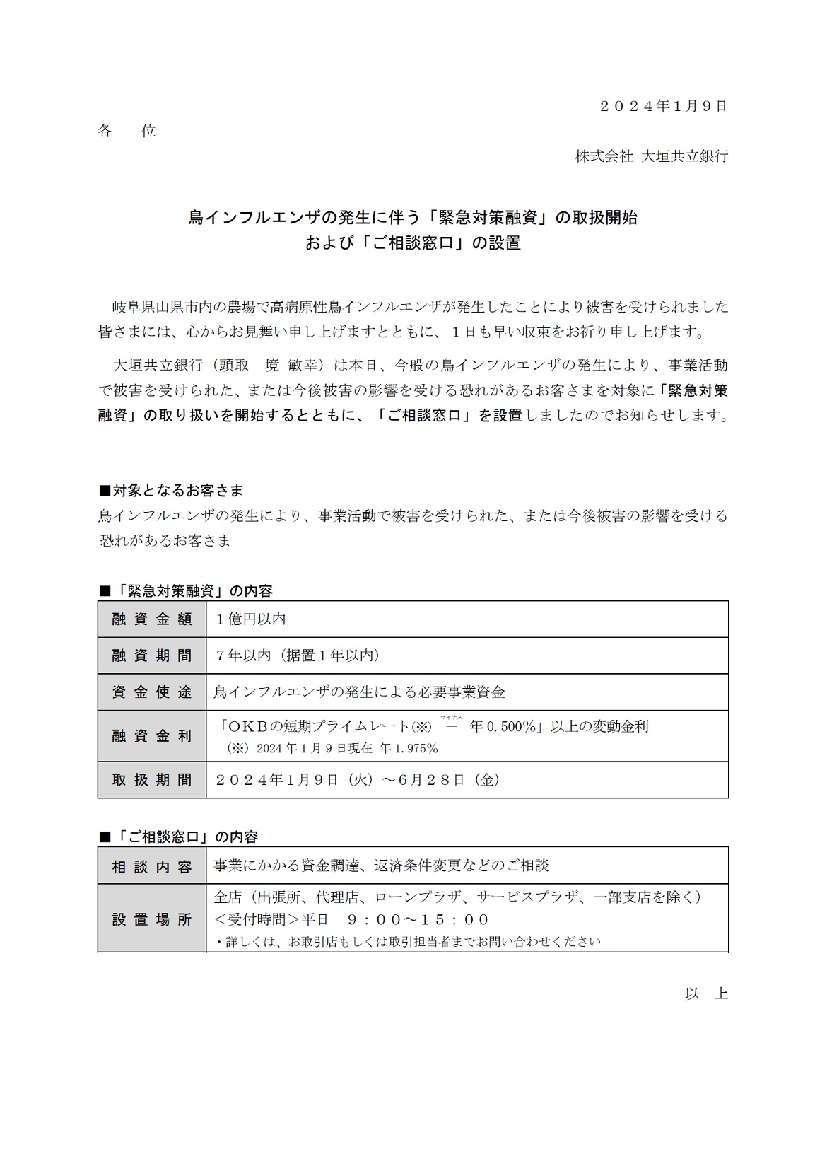 鳥インフルエンザの発生に伴う「緊急対策融資」の取扱開始および「ご相談窓口」の設置