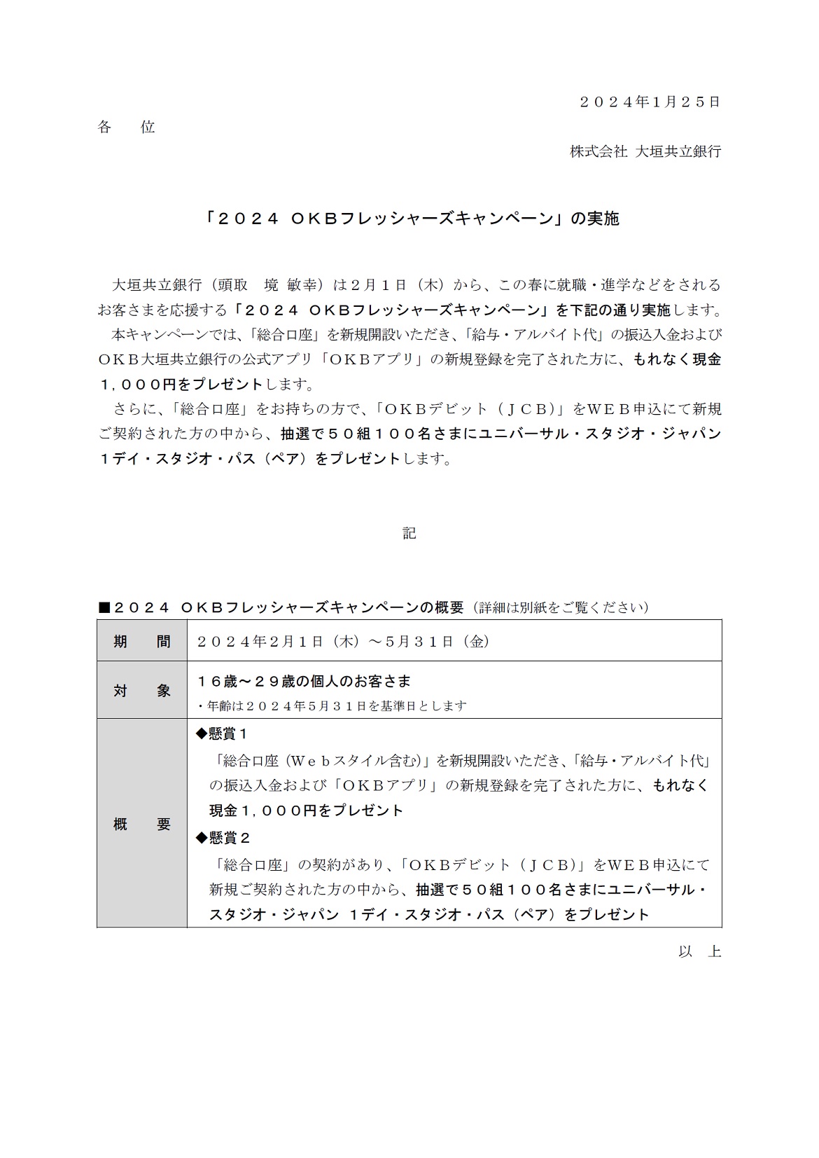 「2024 OKBフレッシャーズキャンペーン」の実施