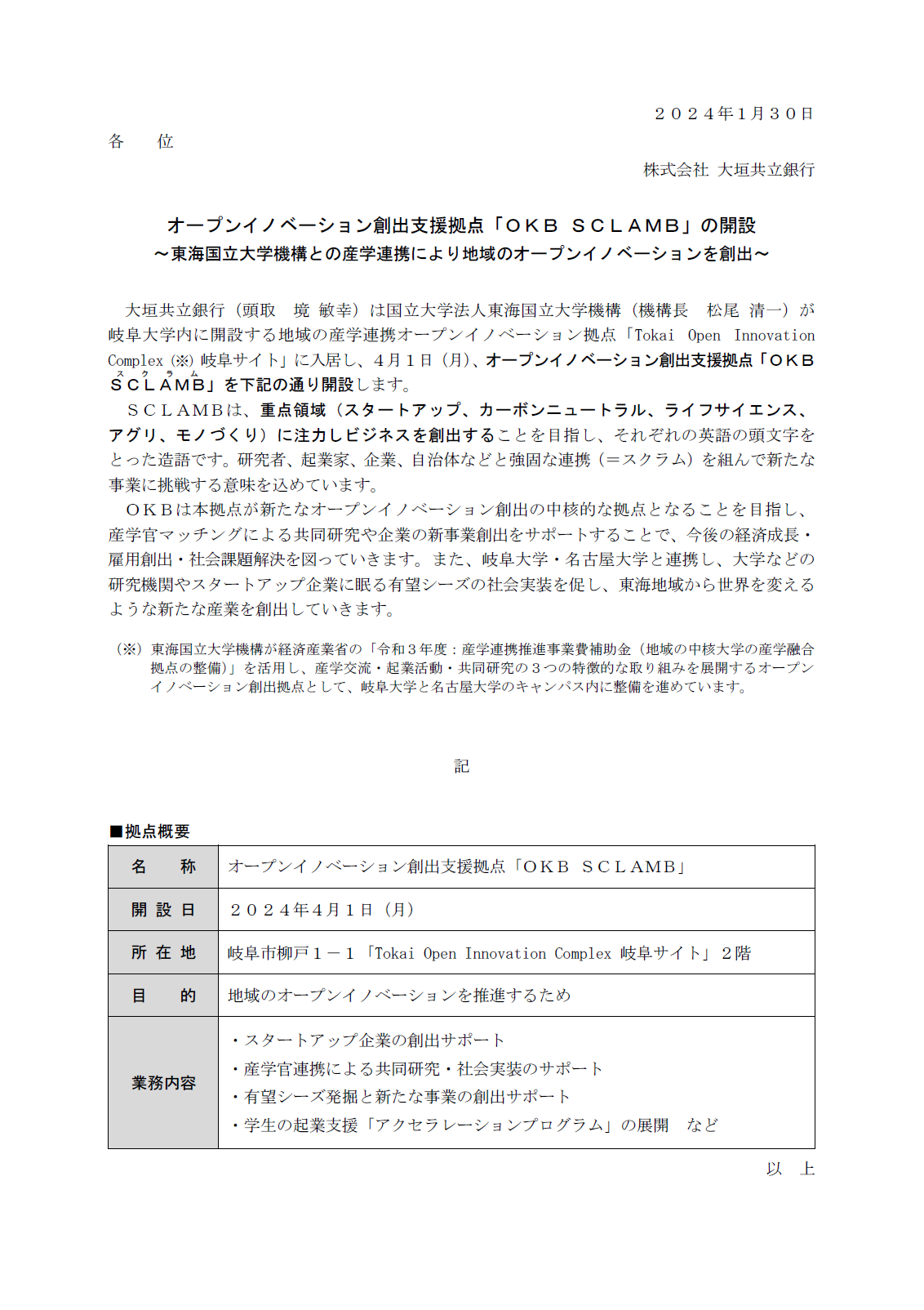 オープンイノベーション創出支援拠点「OKB SCLAMB」の開設
