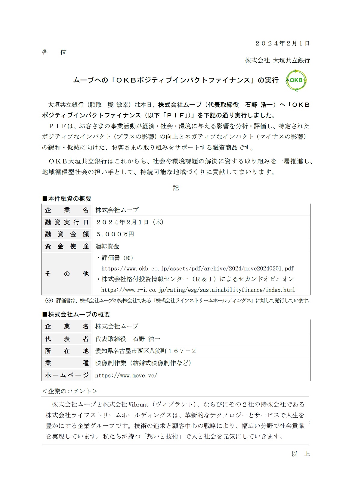 ムーブへの「OKBポジティブインパクトファイナンス」の実行