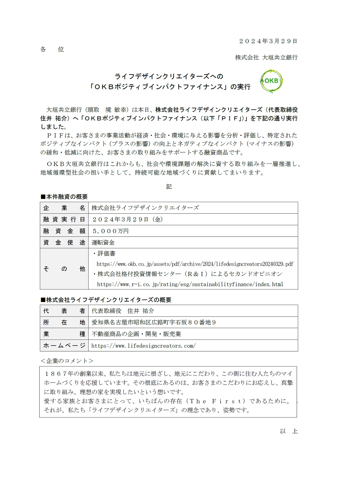 ライフデザインクリエイターズへの 「OKBポジティブインパクトファイナンス」の実行