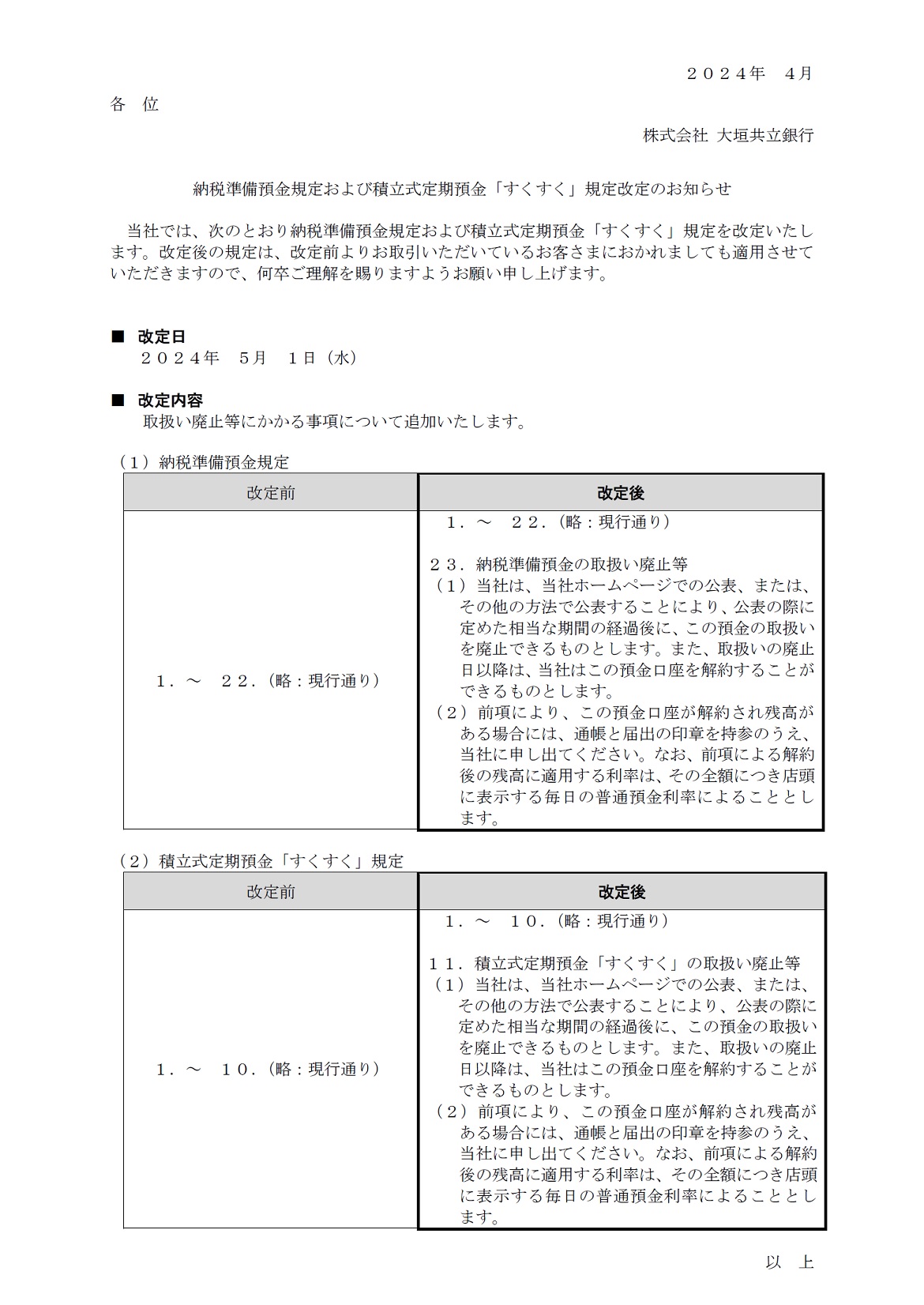 納税準備預金規定および積立式定期預金「すくすく」規定改定のお知らせ