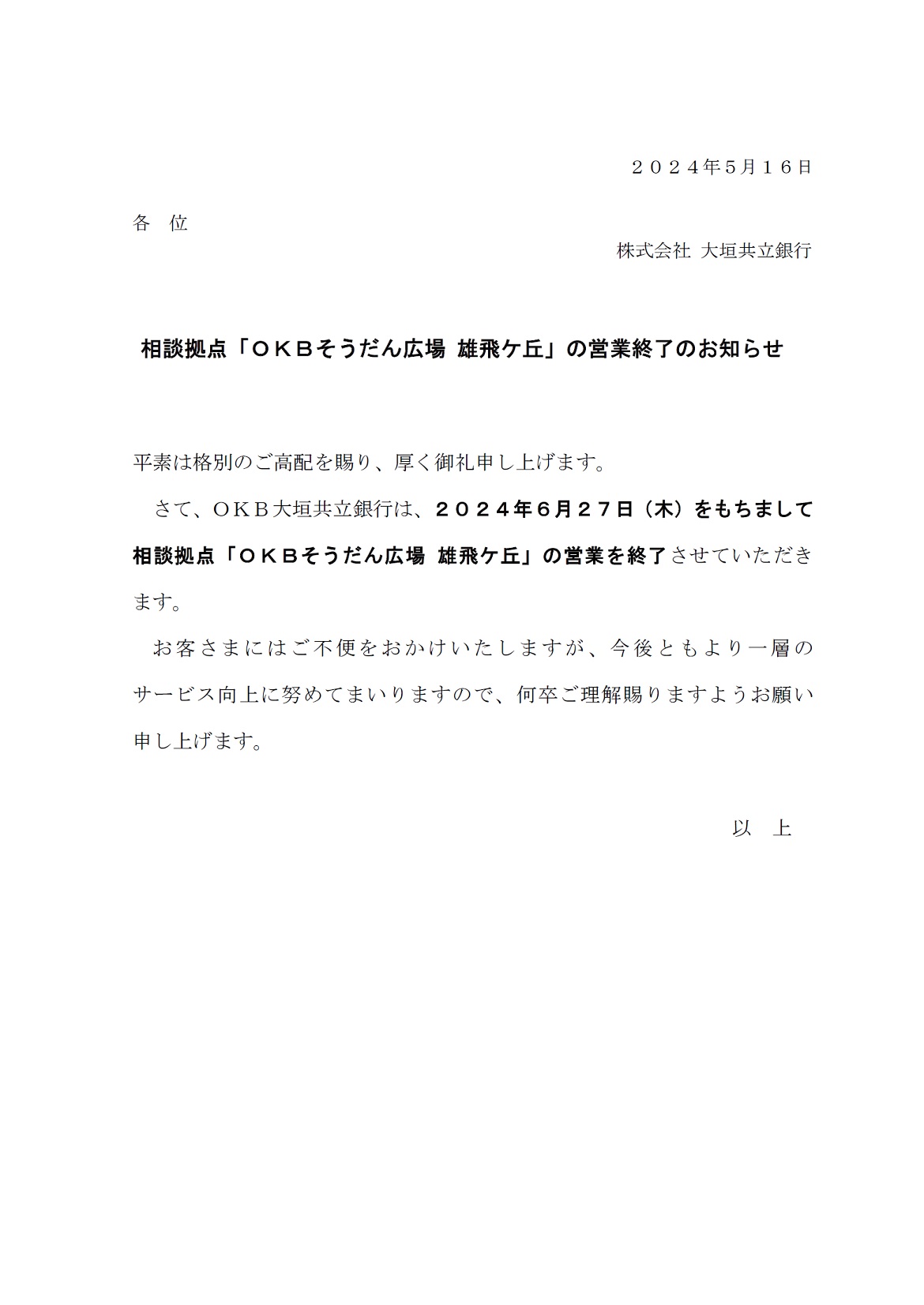 相談拠点「OKBそうだん広場 雄飛ケ丘」の営業終了のお知らせ