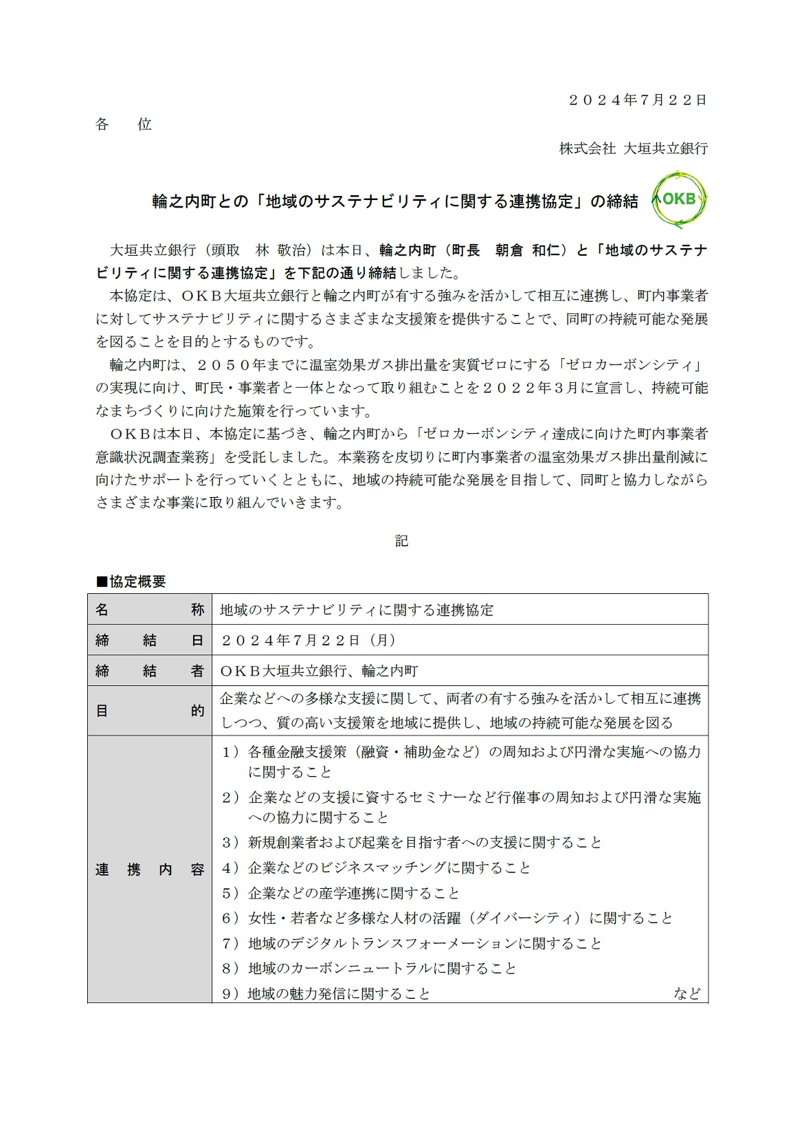 輪之内町との「地域のサステナビリティに関する連携協定」の締結