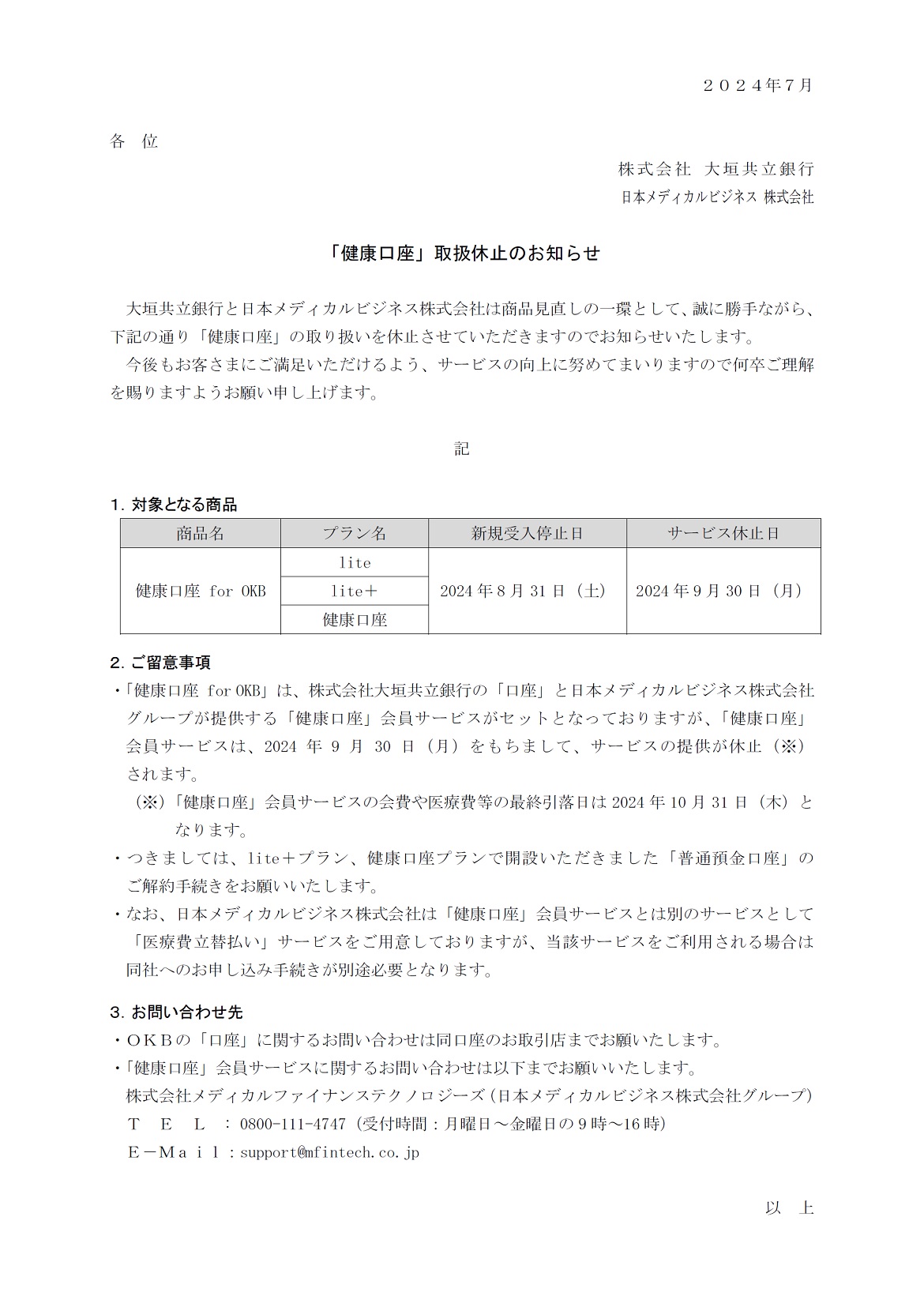 「健康口座」取扱休止のお知らせ