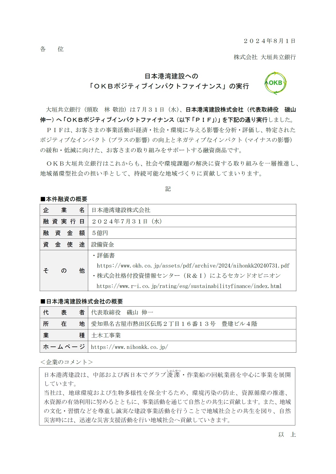 日本港湾建設への 「OKBポジティブインパクトファイナンス」の実行