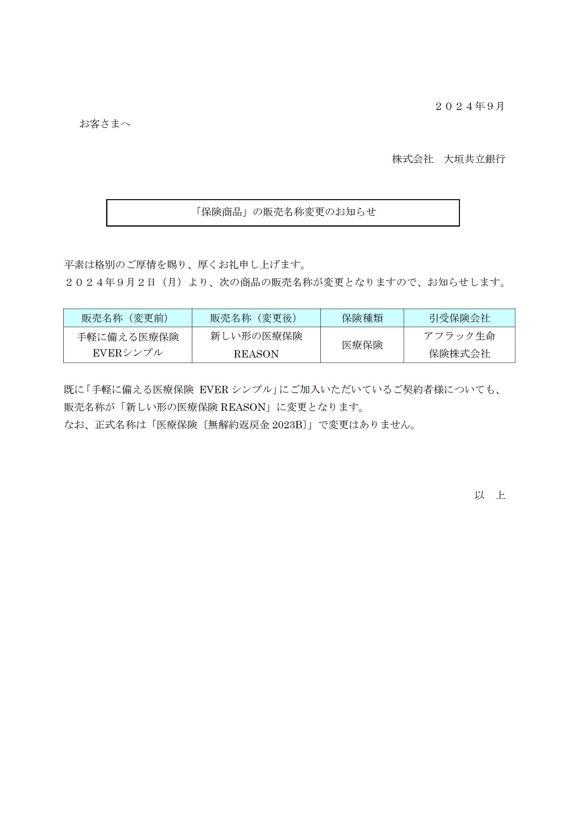 「保険商品」の販売名称変更のお知らせ