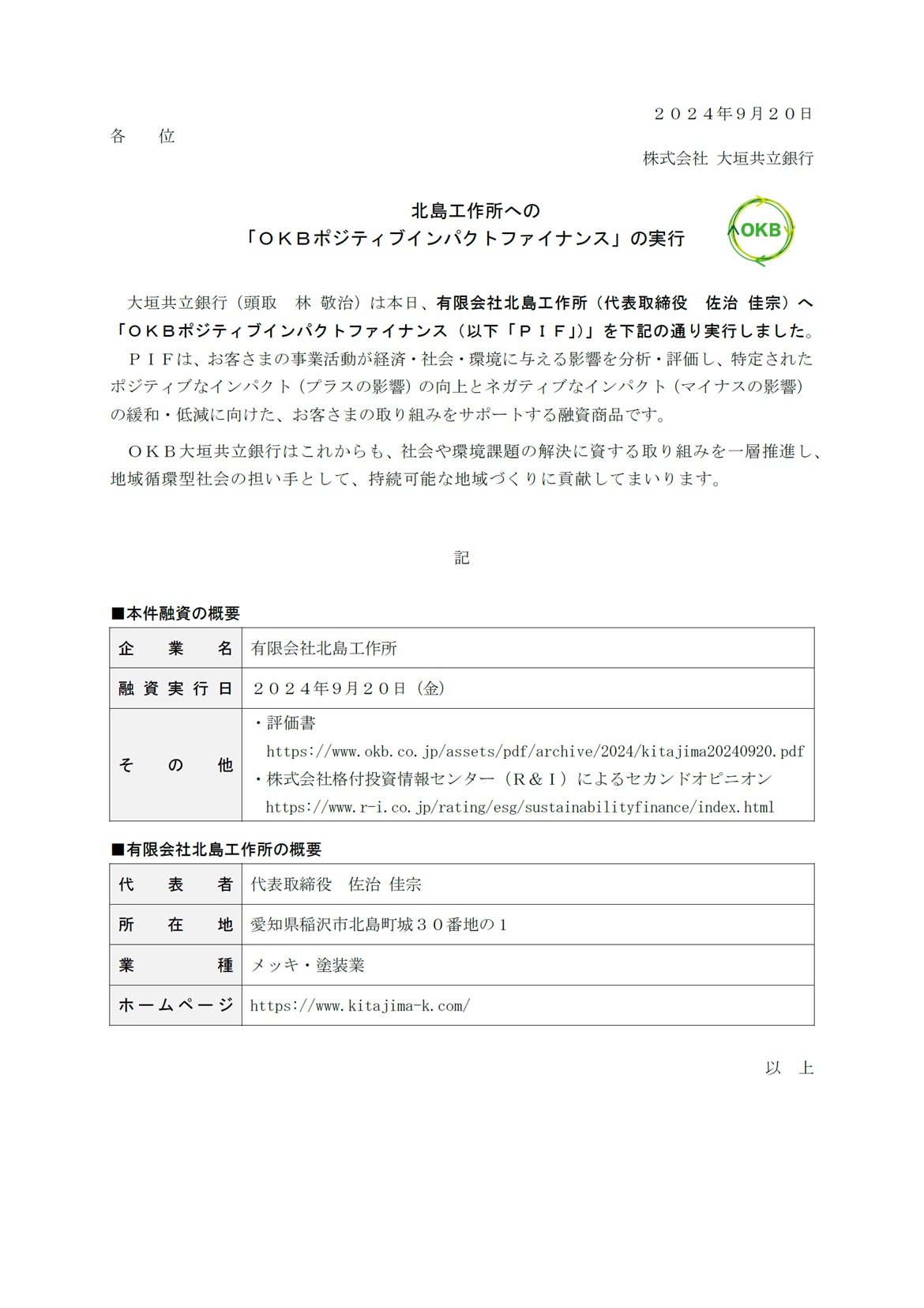 北島工作所への「OKBポジティブインパクトファイナンス」の実行