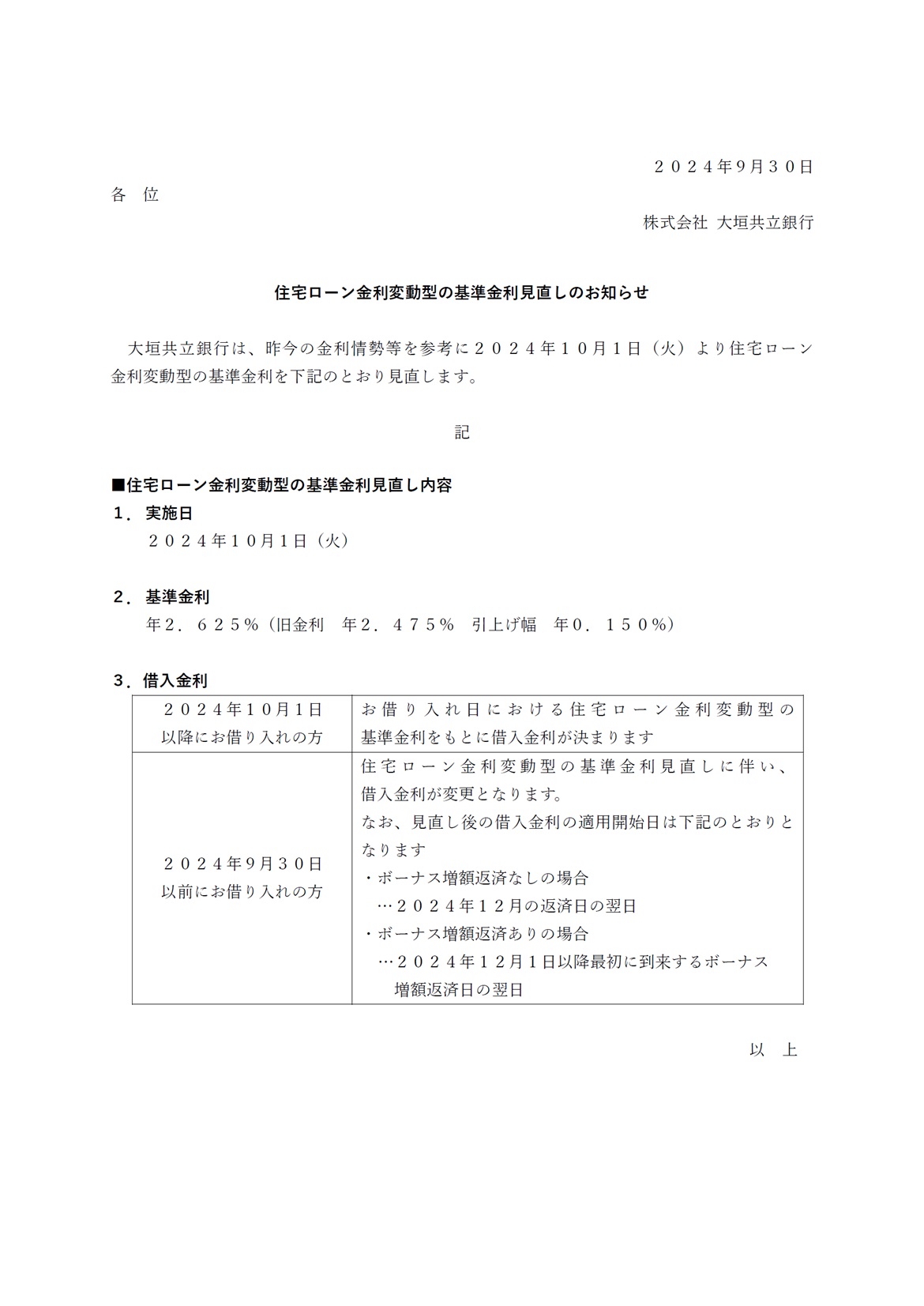 住宅ローン金利変動型の基準金利見直しのお知らせ