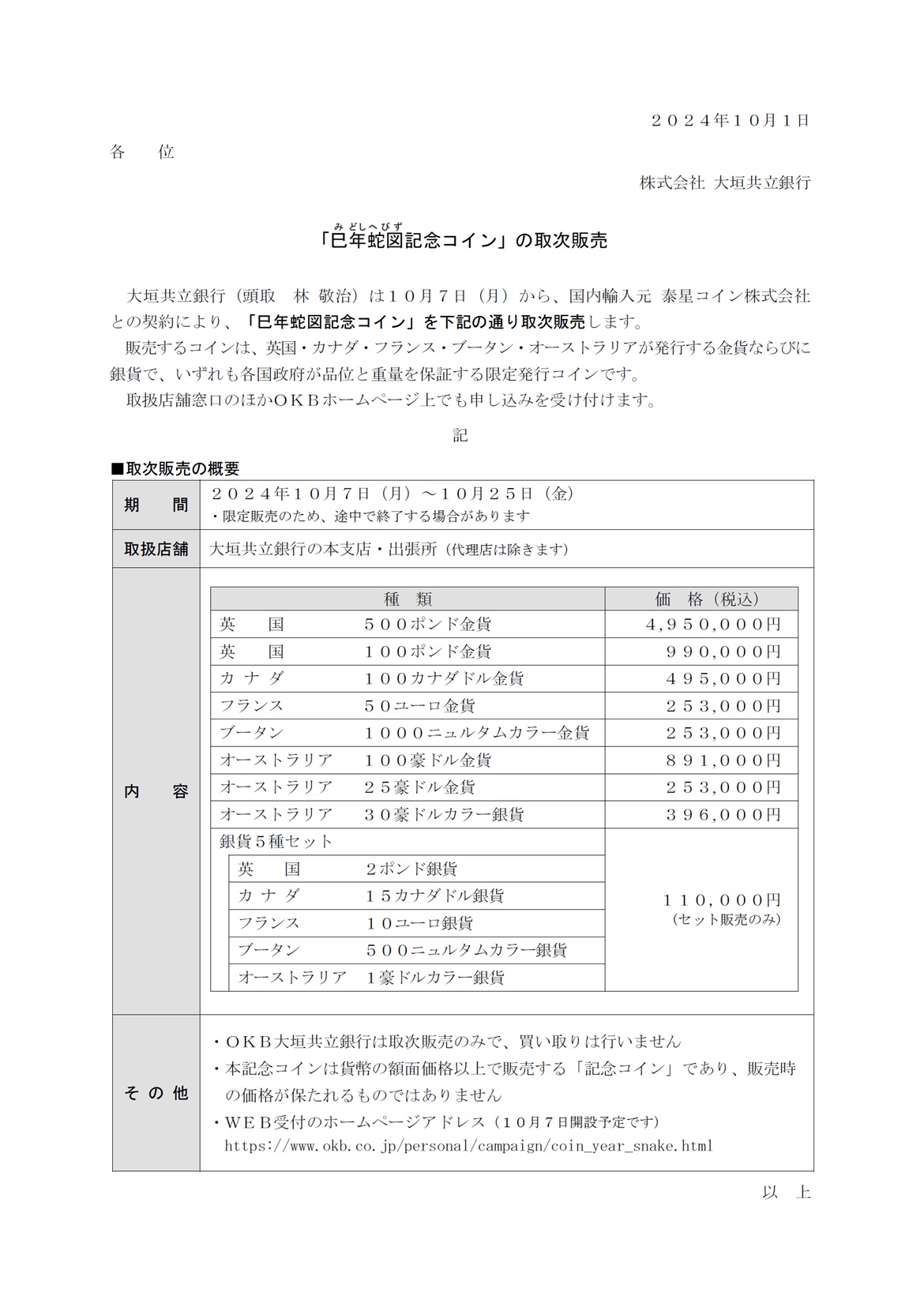 「巳年蛇図記念コイン」の取次販売