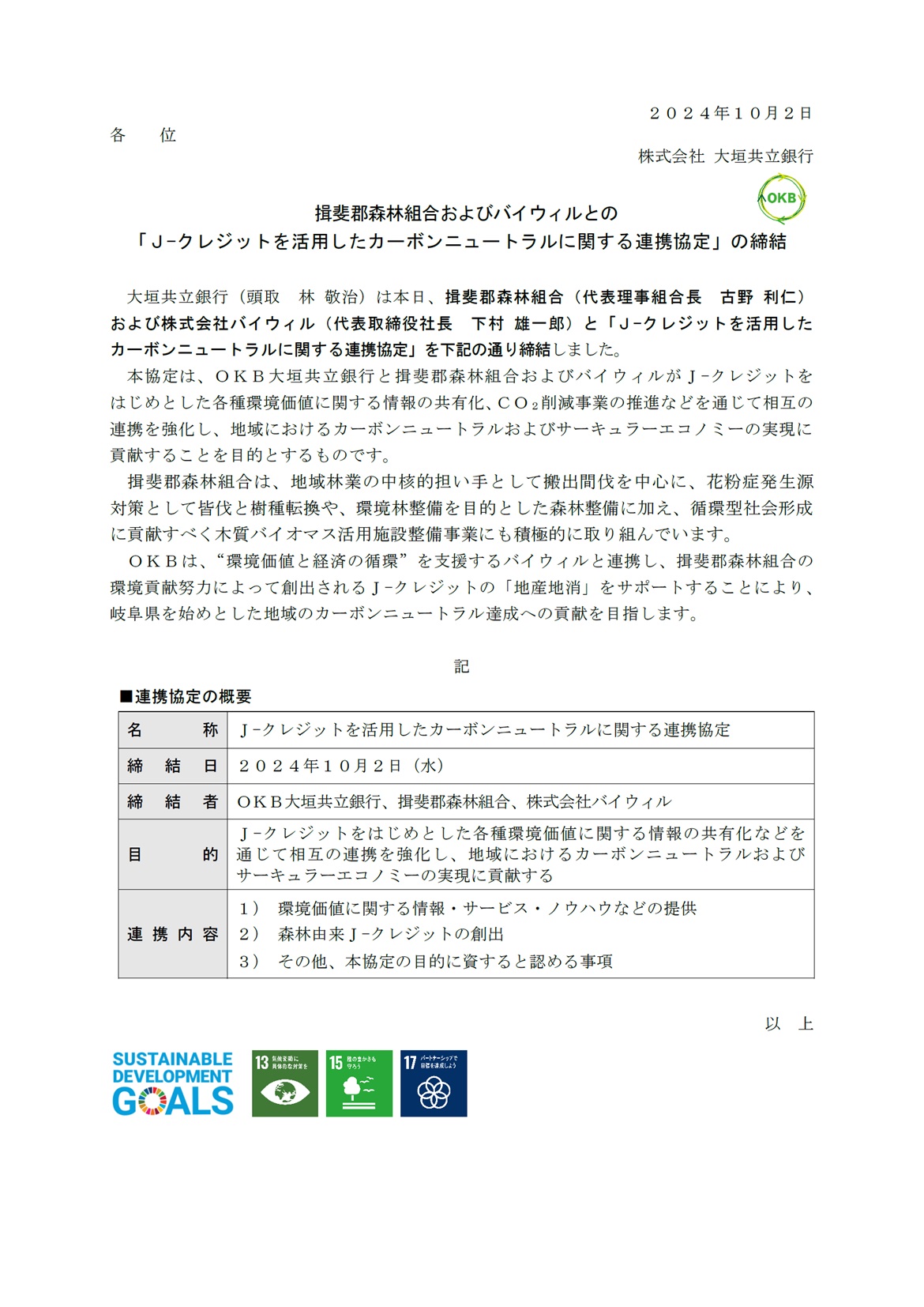 揖斐郡森林組合およびバイウィルとの「J-クレジットを活用したカーボンニュートラルに関する連携協定」の締結