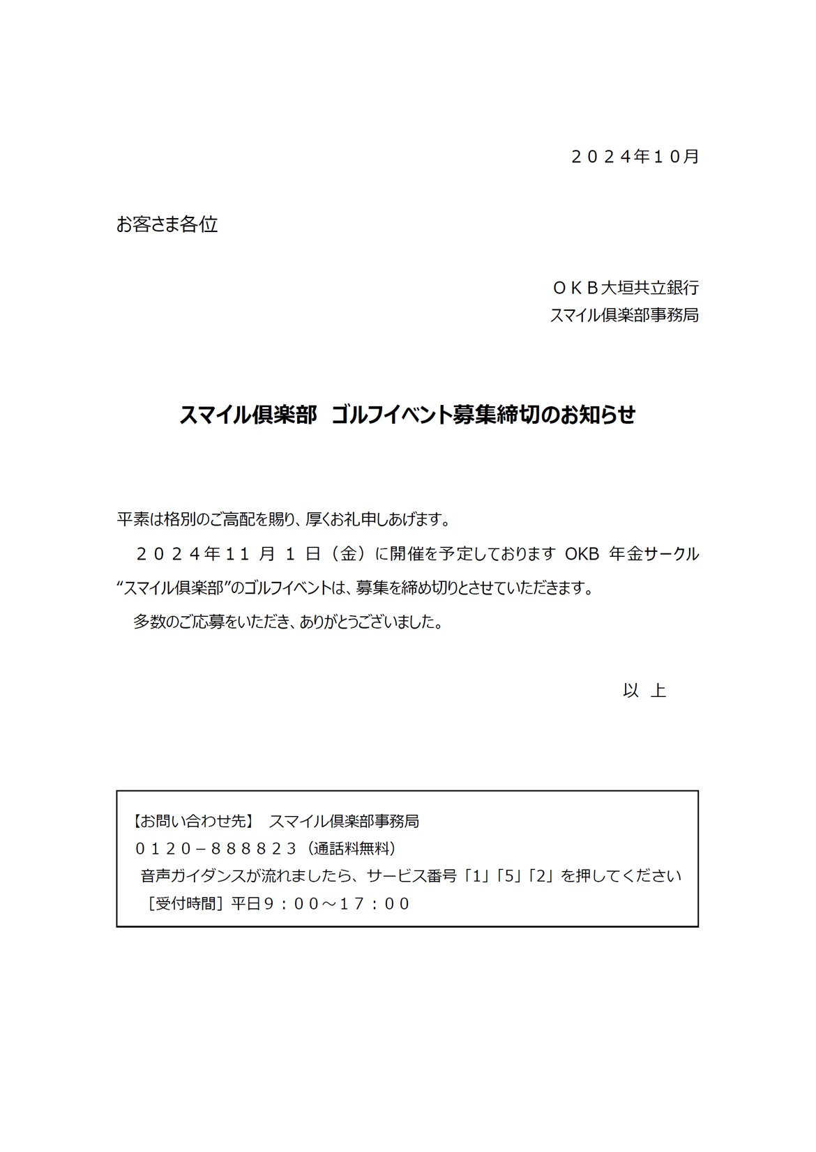 スマイル俱楽部 ゴルフイベント募集締切のお知らせ