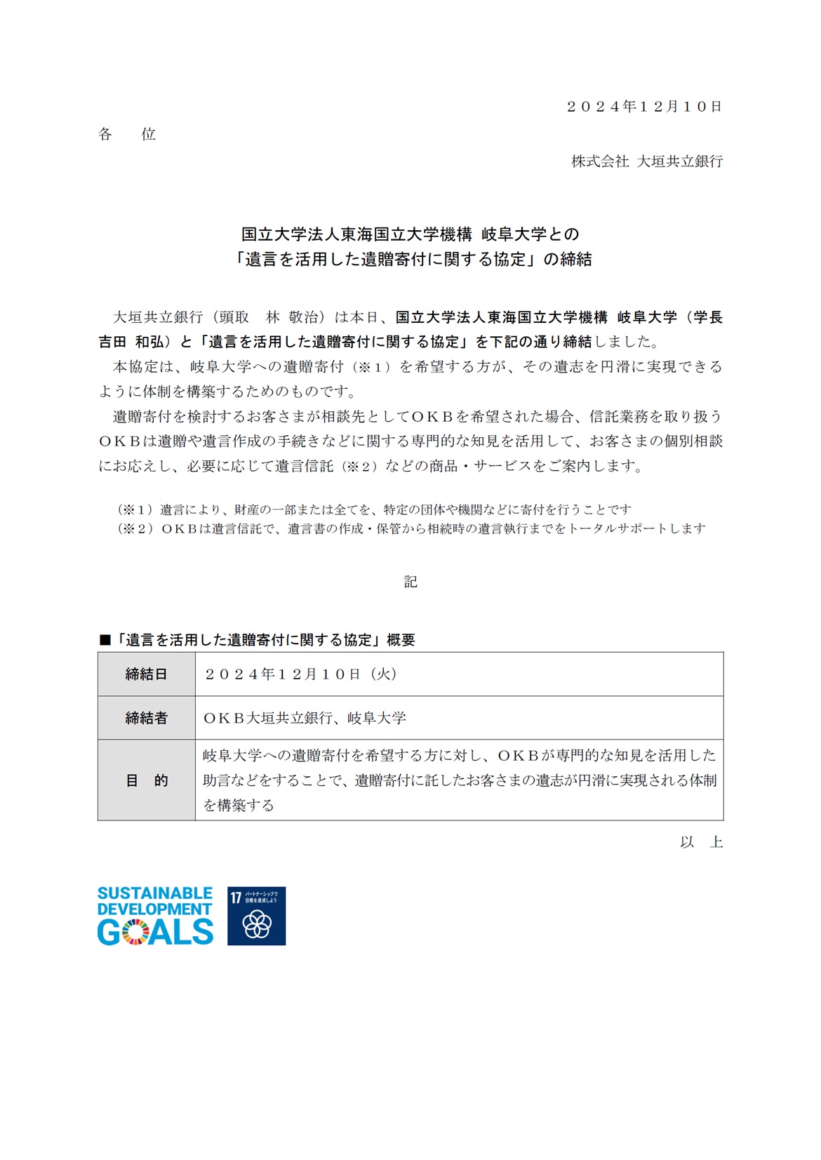 国立大学法人東海国立大学機構 岐阜大学との「遺言を活用した遺贈寄付に関する協定」の締結