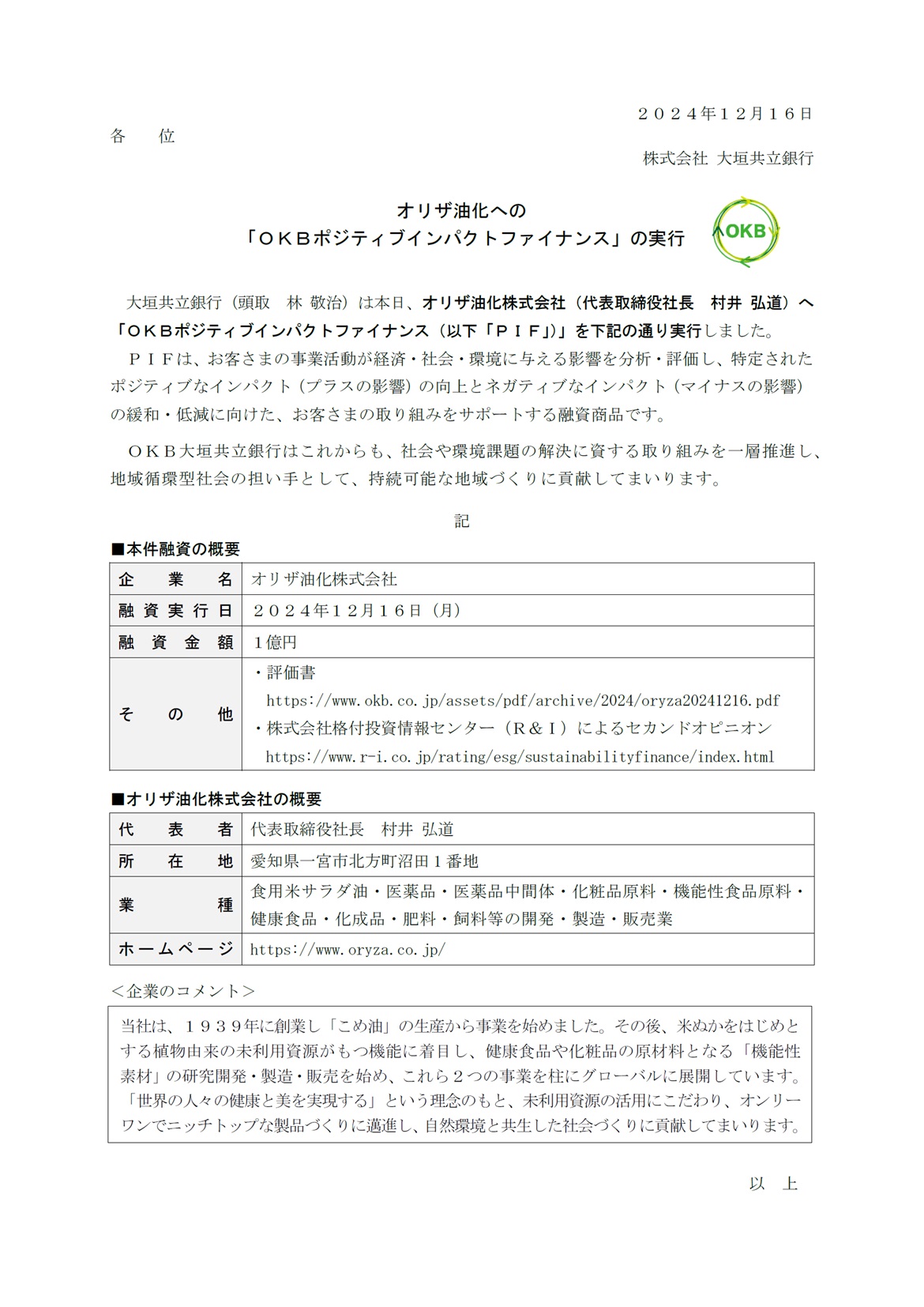 オリザ油化への「OKBポジティブインパクトファイナンス」の実行