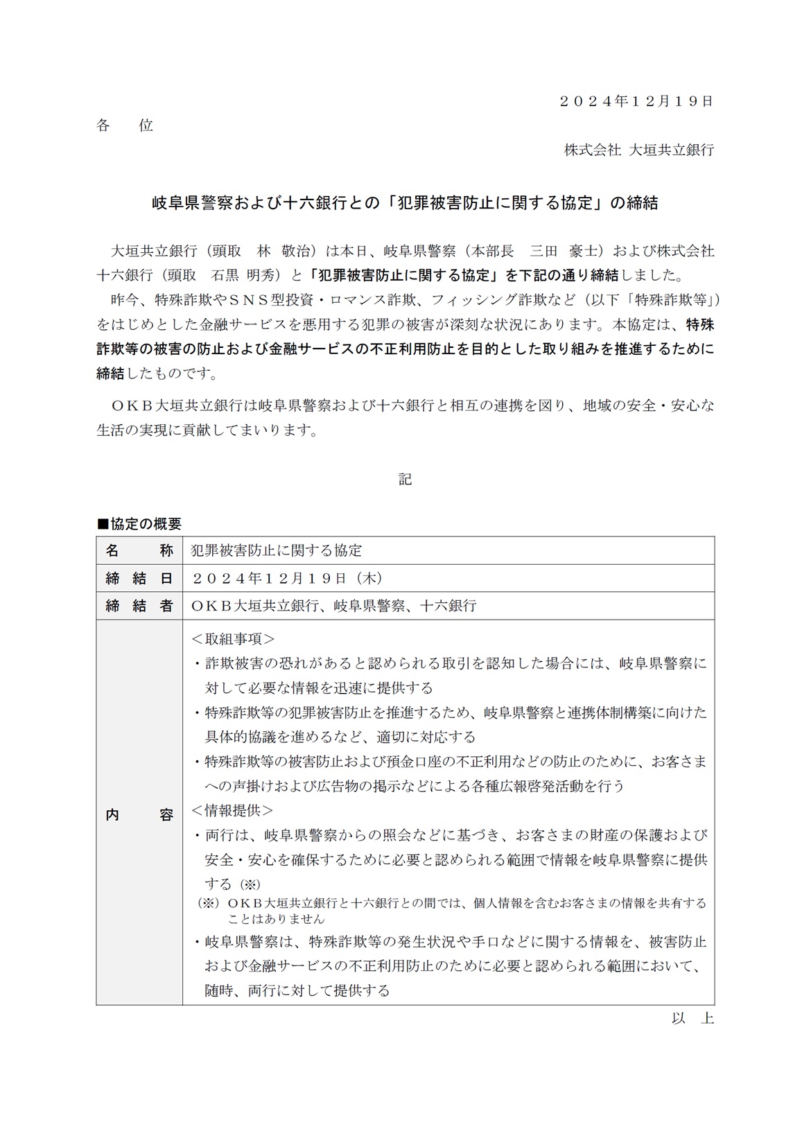 岐阜県警察および十六銀行との「犯罪被害防止に関する協定」の締結