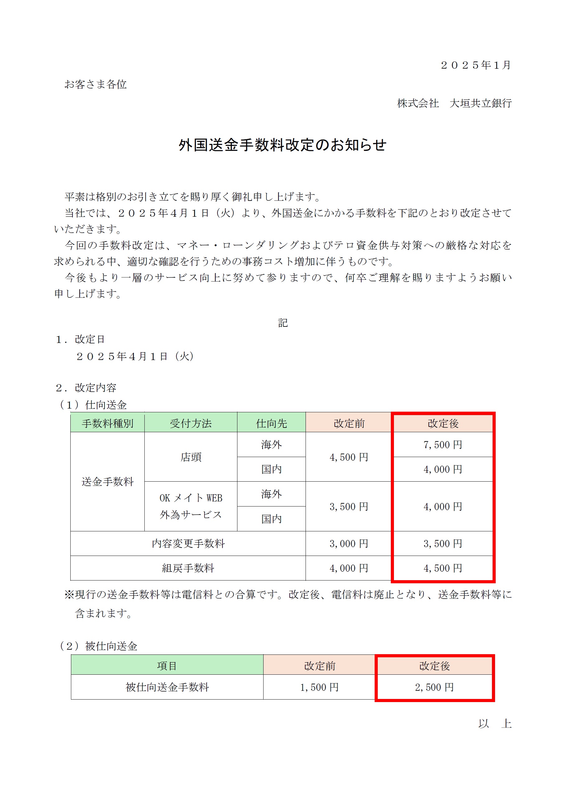 外国送金手数料改定のお知らせ