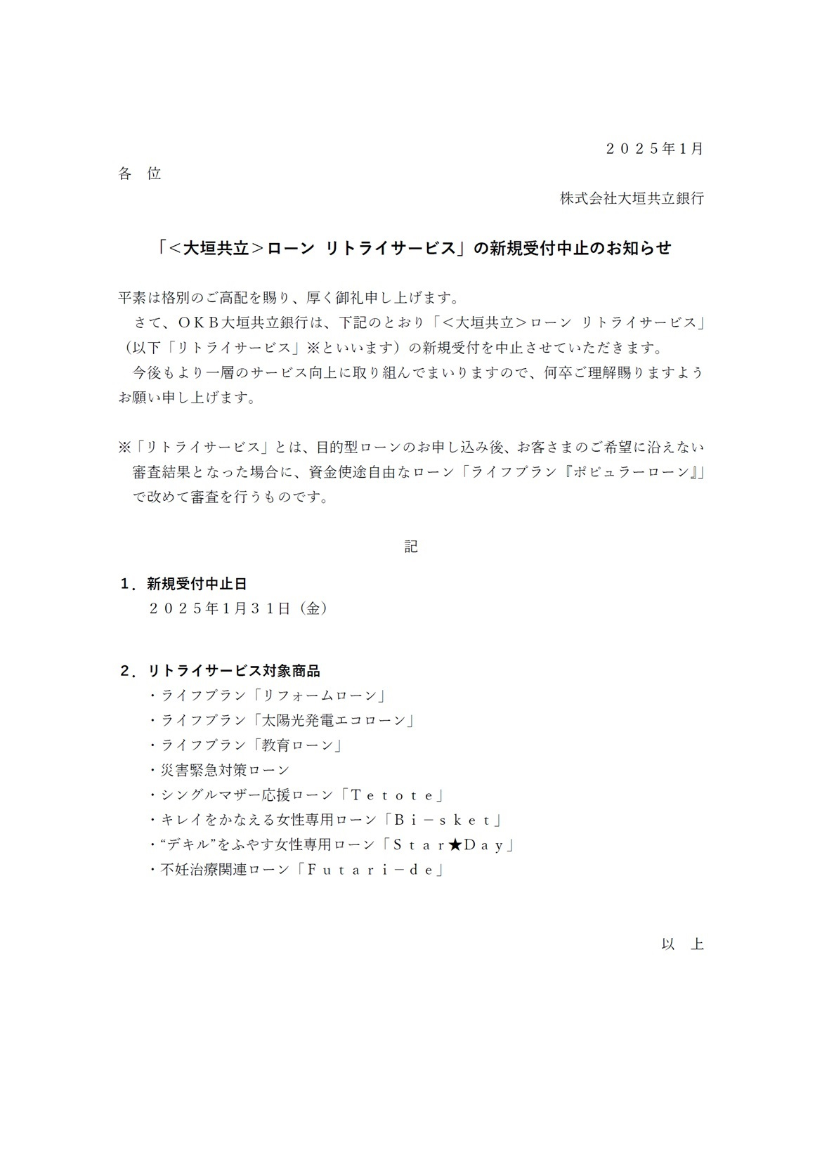 「<大垣共立>ローン リトライサービス」の新規受付中止のお知らせ
