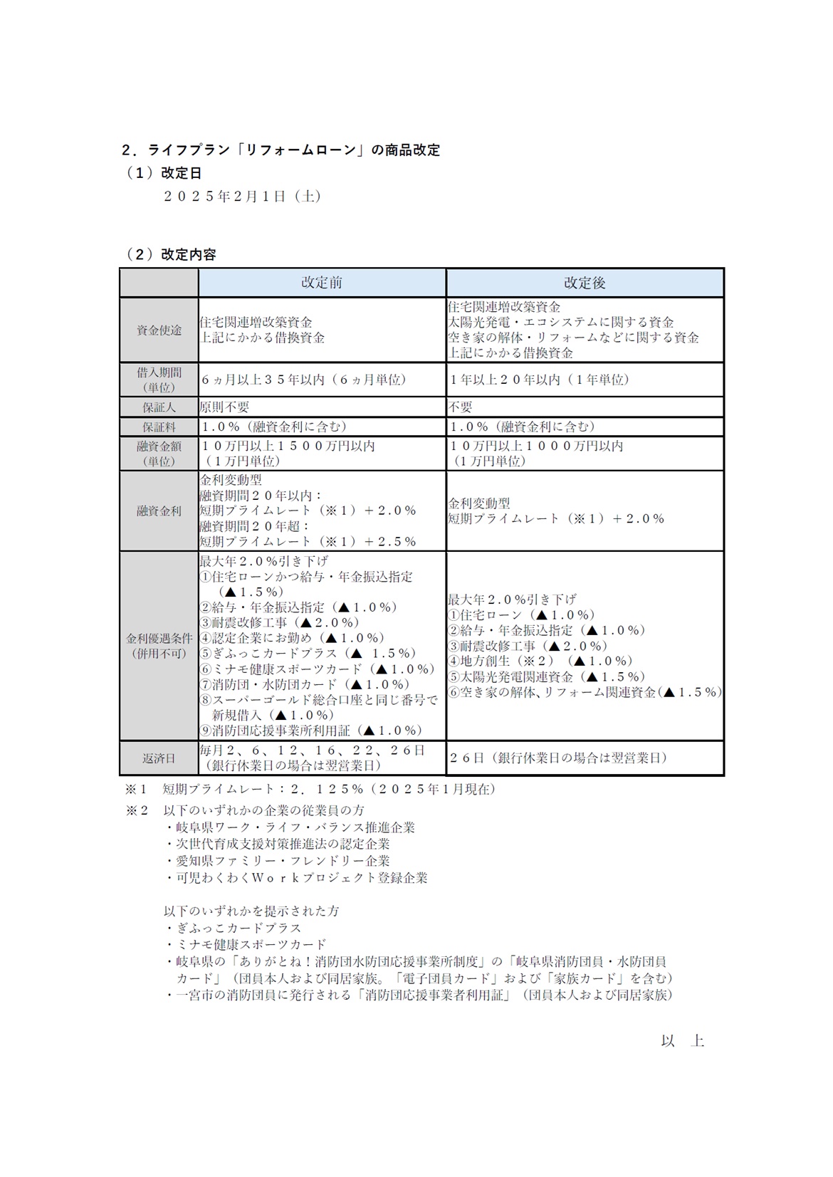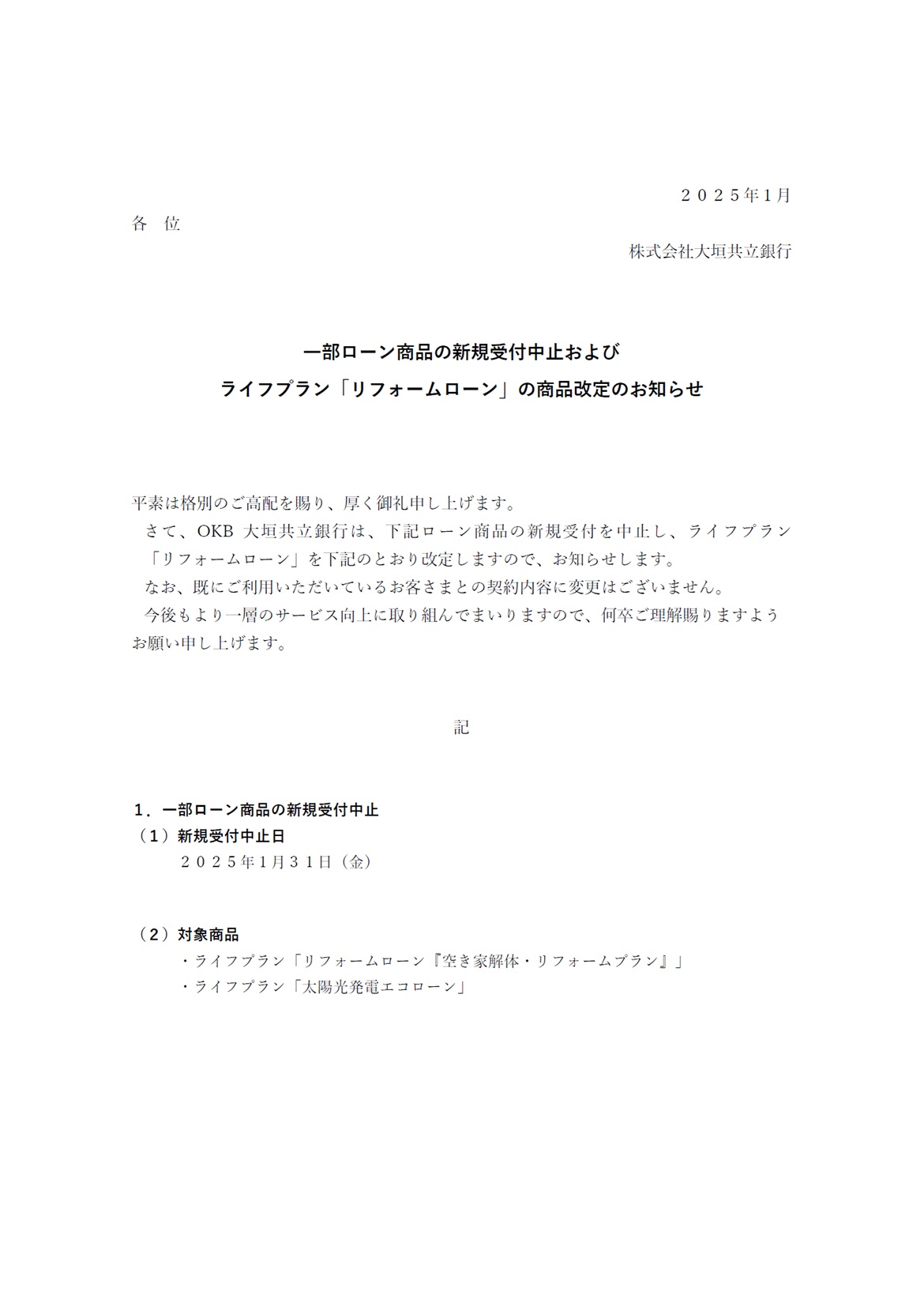 一部ローン商品の新規受付中止およびライフプラン「リフォームローン」の商品改定のお知らせ