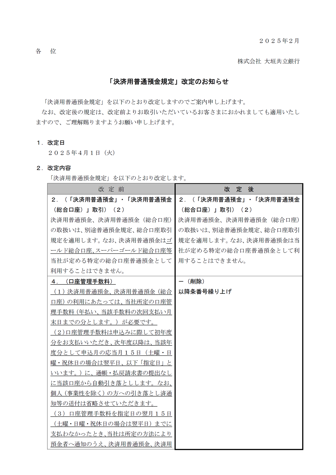 「決済用普通預金規定」改定のお知らせ