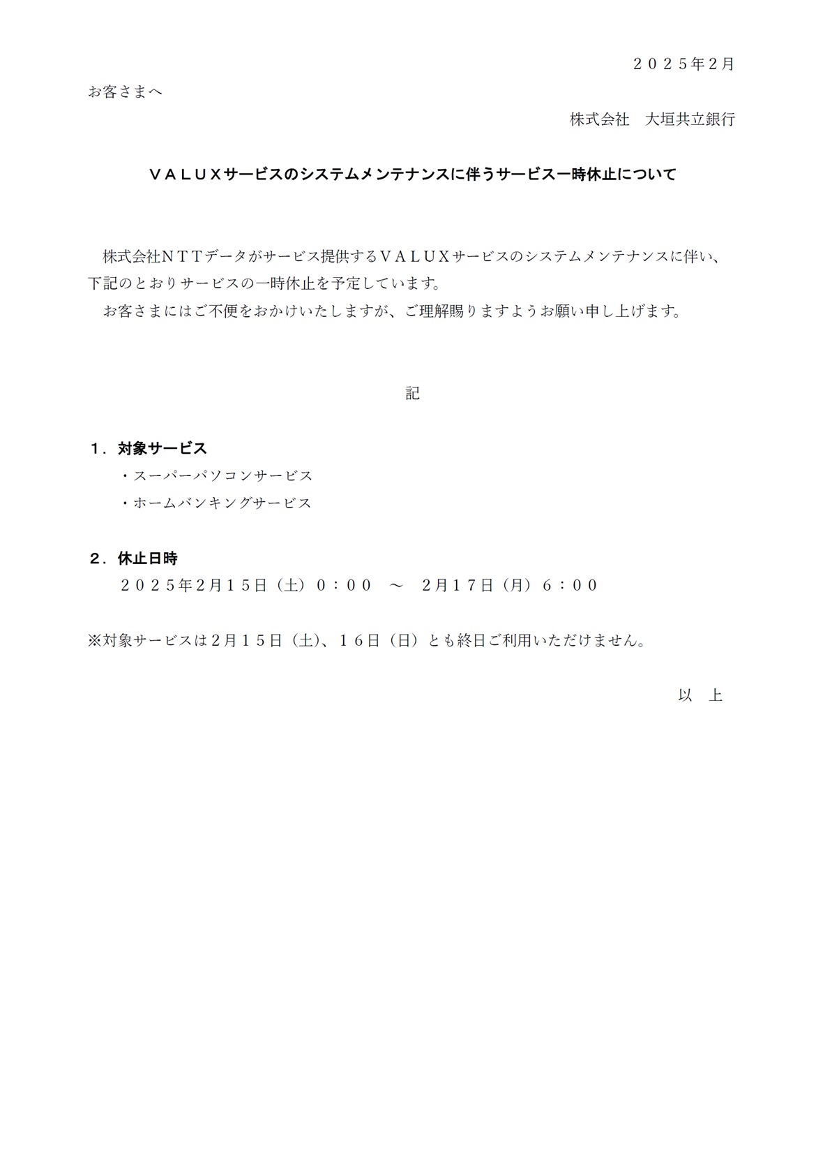 VALUXサービスのシステムメンテナンスに伴うサービス一時休止について