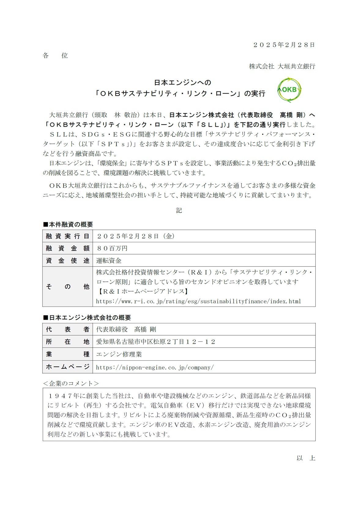 日本エンジンへの「OKBサステナビリティ・リンク・ローン」の実行