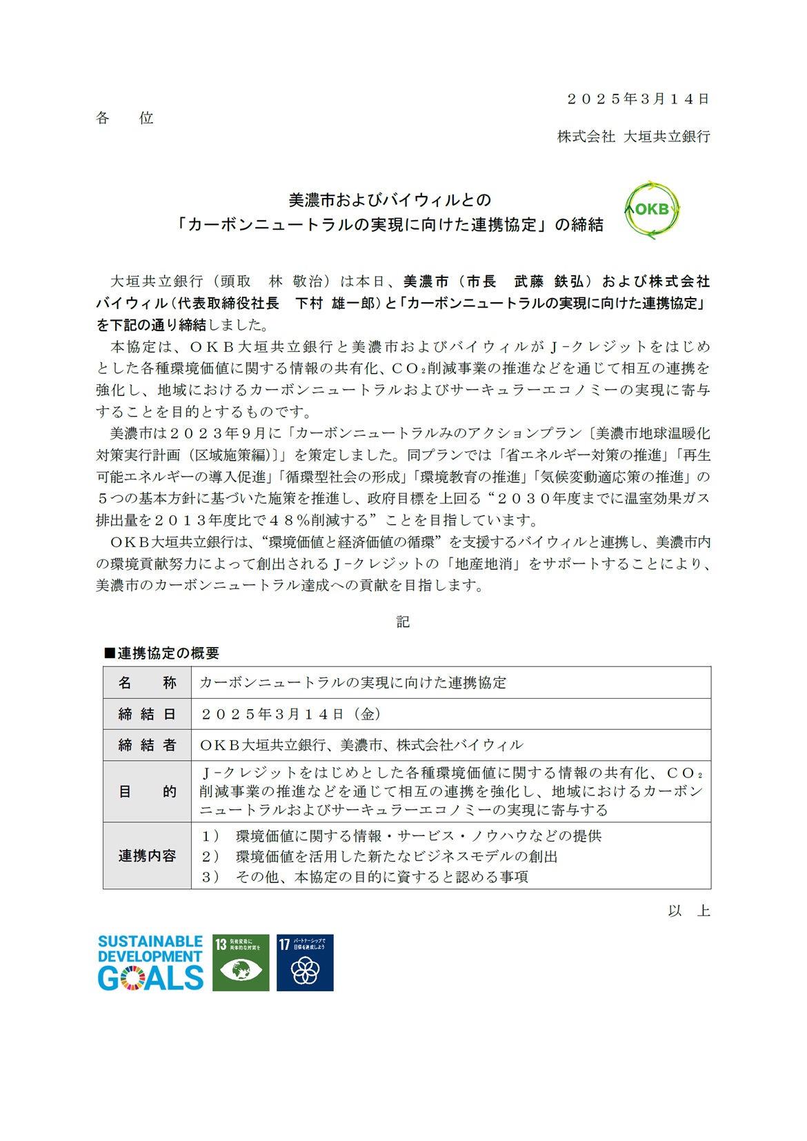 美濃市およびバイウィルとの「カーボンニュートラルの実現に向けた連携協定」の締結