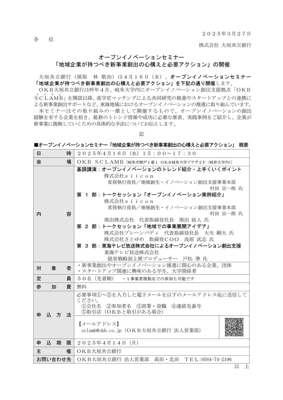 オープンイノベーションセミナー「地域企業が持つべき新事業創出の心構えと必要アクション」の開催