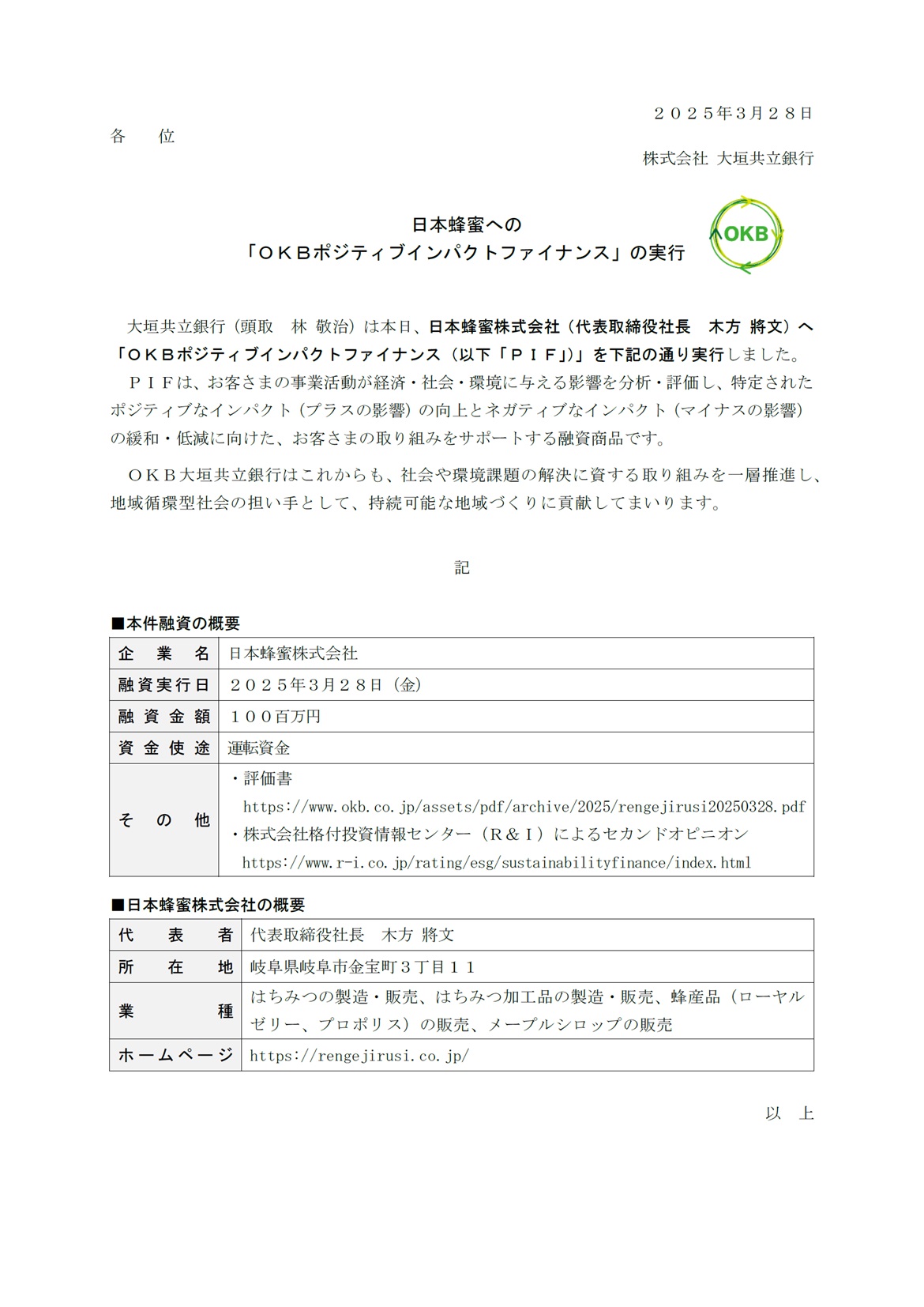 日本蜂蜜への「OKBポジティブインパクトファイナンス」の実行