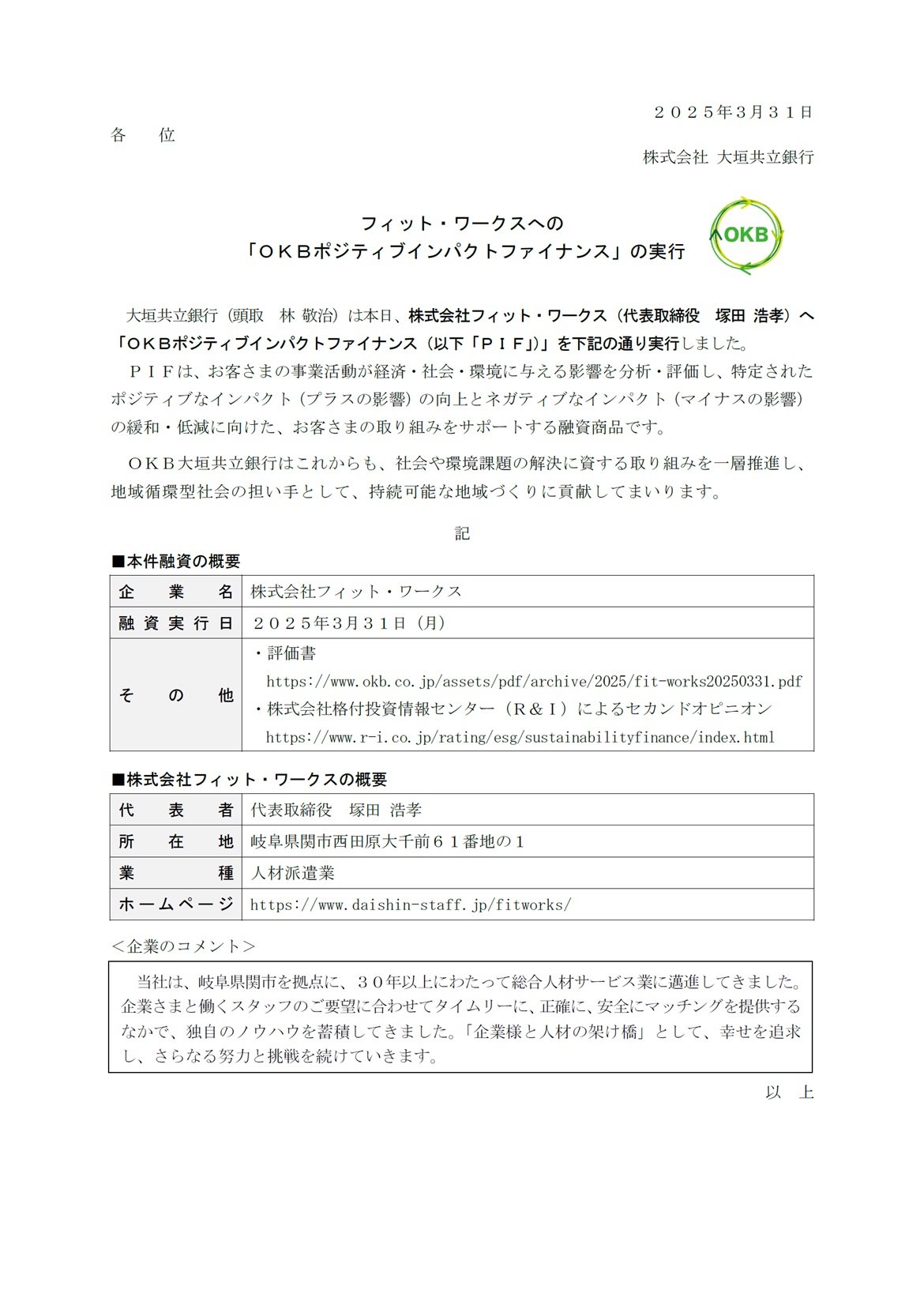 フィット・ワークスへの「OKBポジティブインパクトファイナンス」の実行