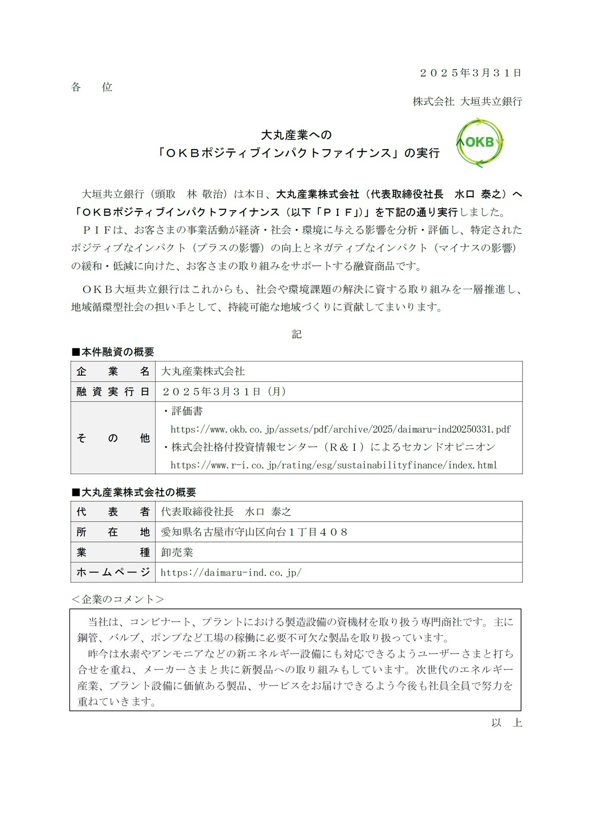 大丸産業への「OKBポジティブインパクトファイナンス」の実行