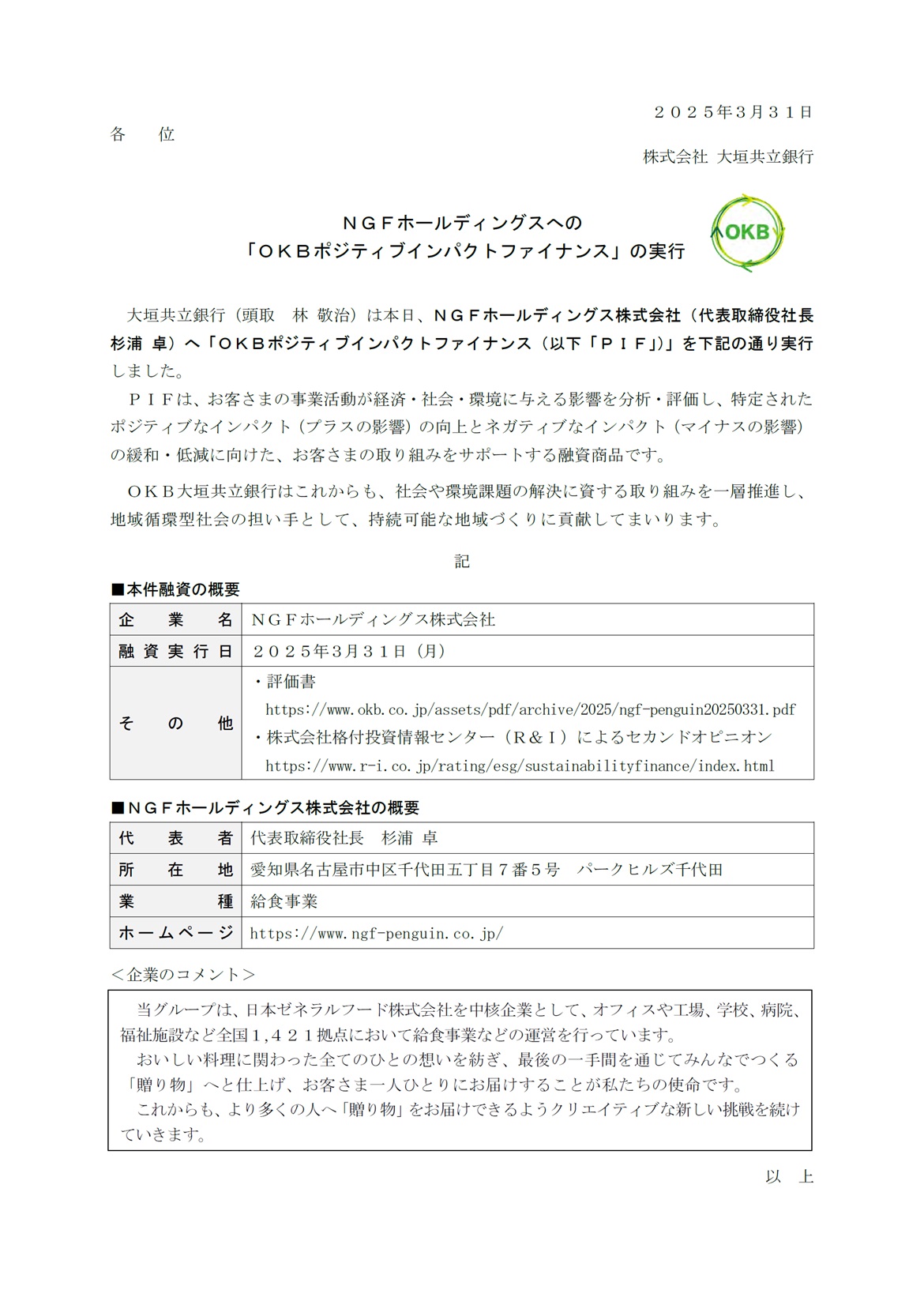 NGFホールディングスへの「OKBポジティブインパクトファイナンス」の実行