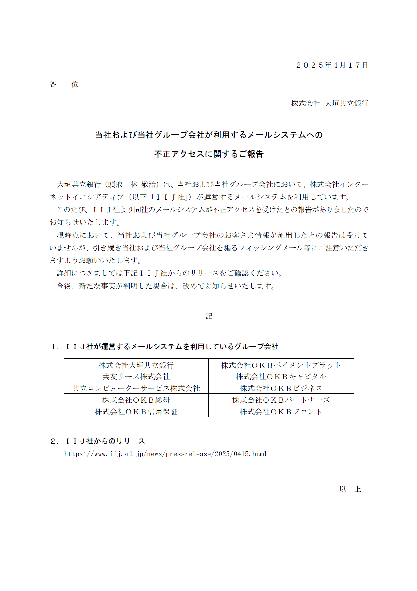 当社および当社グループ会社が利用するメールシステムへの不正アクセスに関するご報告