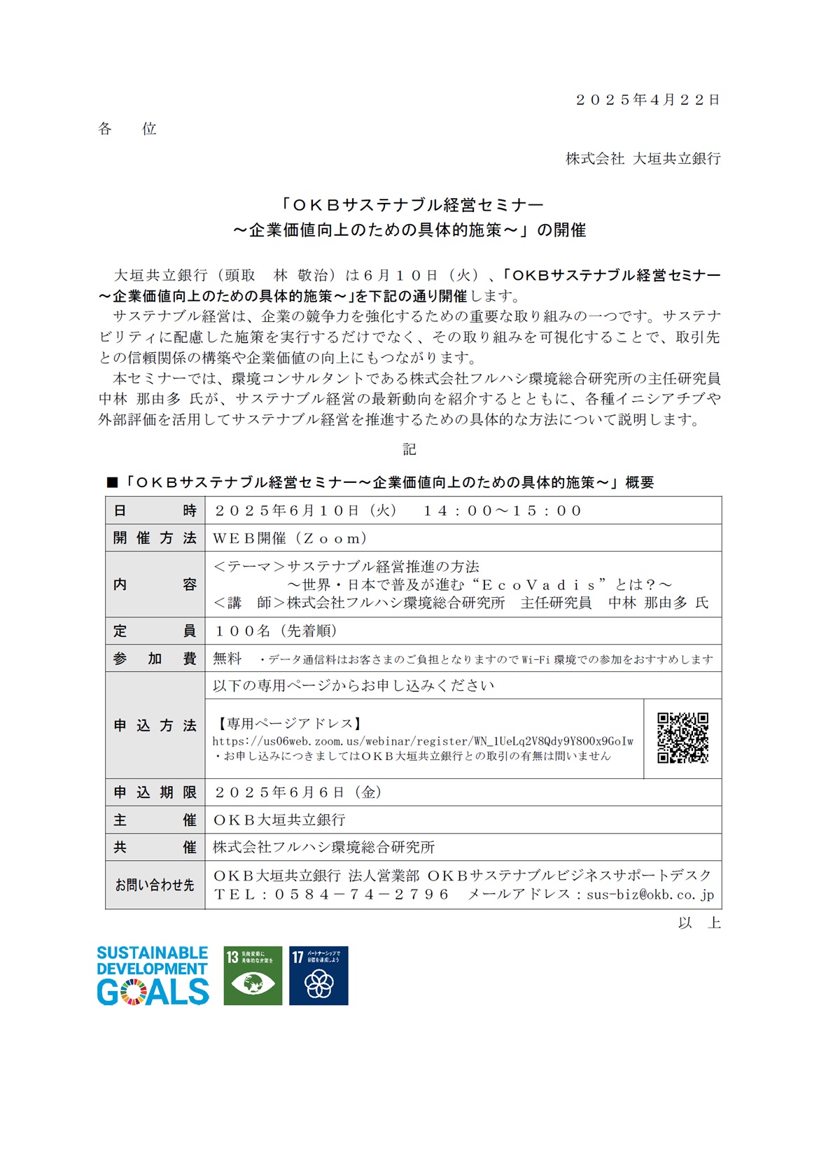 「OKBサステナブル経営セミナー~企業価値向上のための具体的施策~」の開催