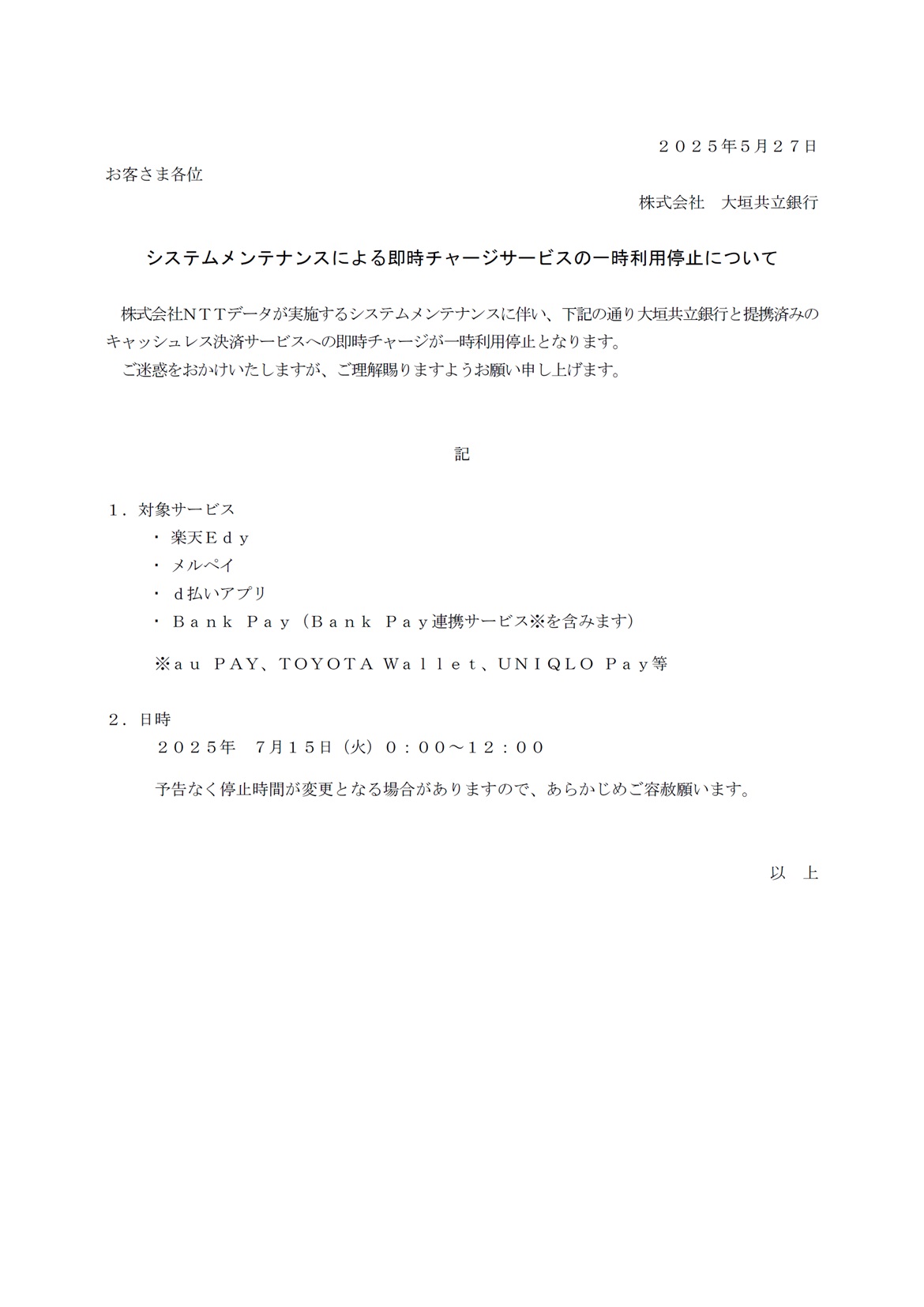 システムメンテナンスによる即時チャージサービスの一時利用停止について