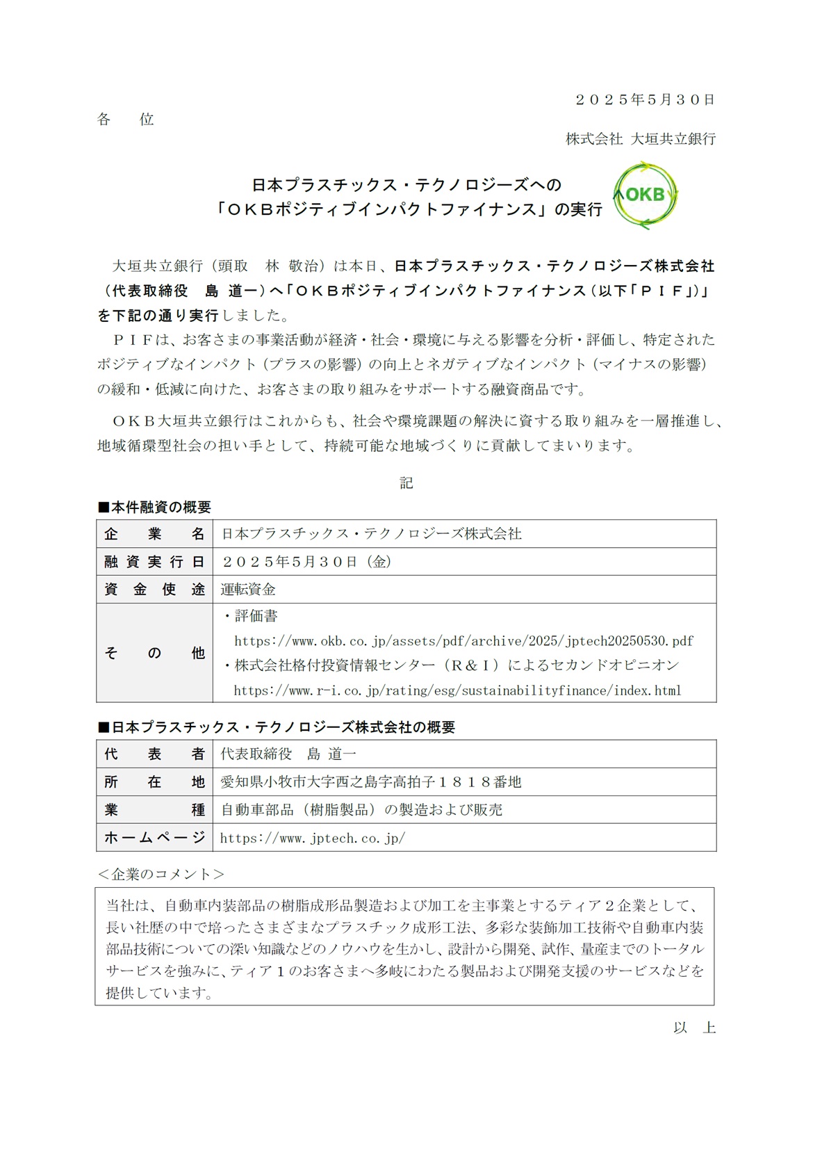 日本プラスチックス・テクノロジーズへの「OKBポジティブインパクトファイナンス」の実行