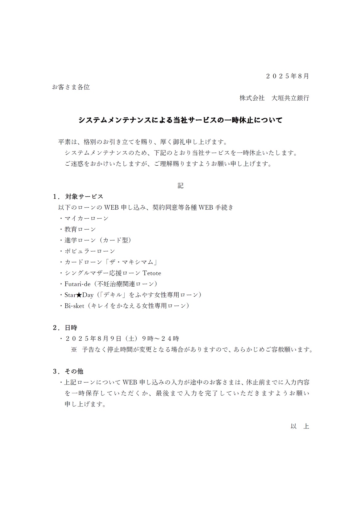 システムメンテナンスによる当社サービスの一時休止について