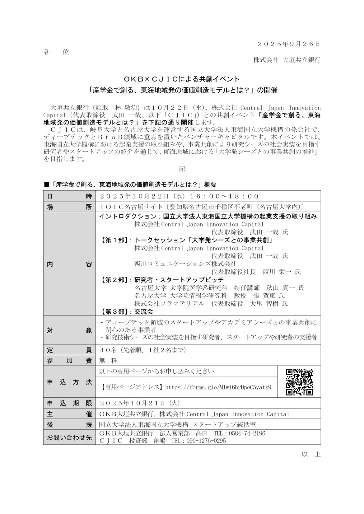 OKB×CJICによる共創イベント「産学金で創る、東海地域発の価値創造モデルとは?」の開催