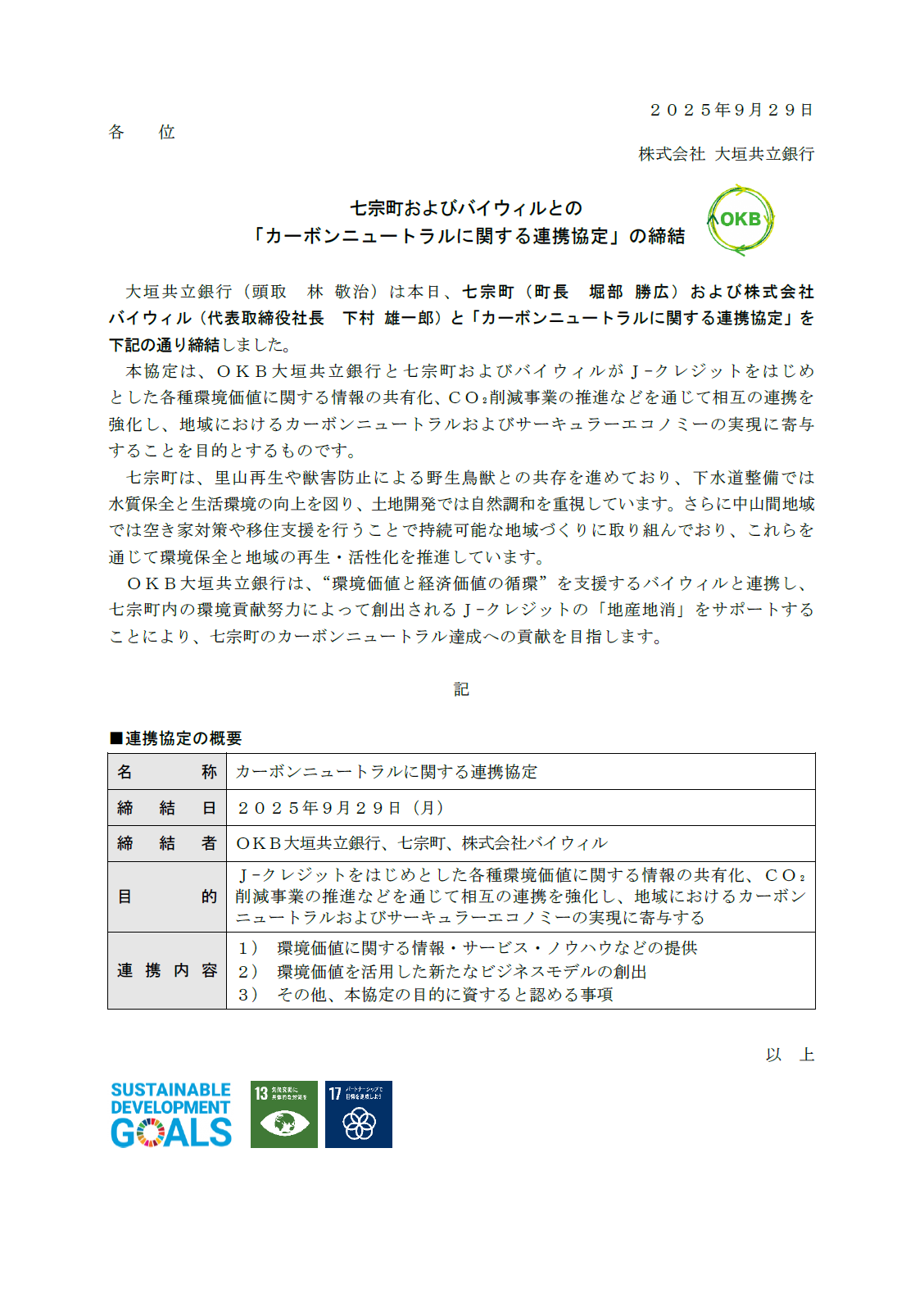 七宗町およびバイウィルとの「カーボンニュートラルに関する連携協定」の締結