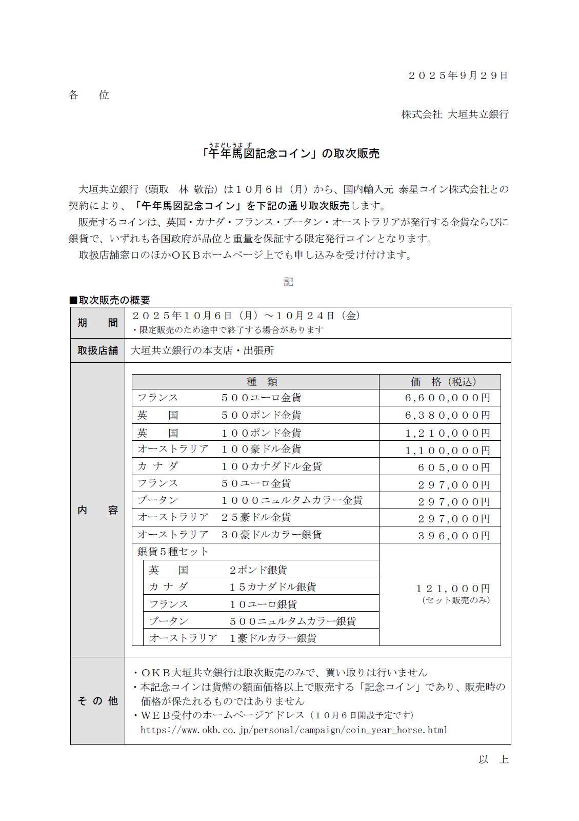 「午年馬図記念コイン」の取次販売